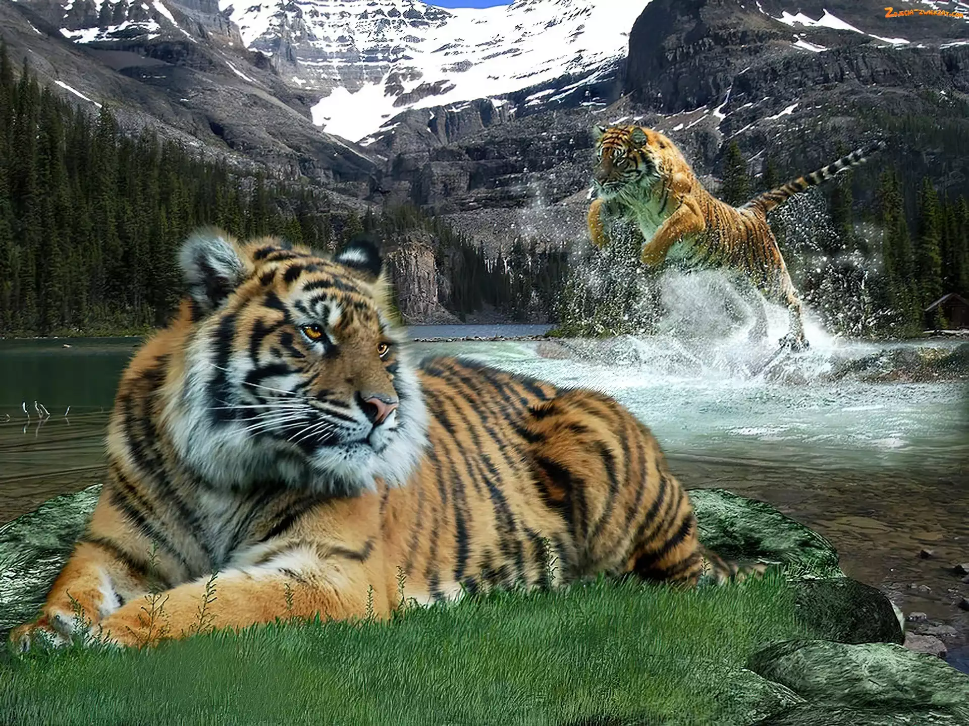 Łąka, Las, Rzeka, Tygrysy, Góry