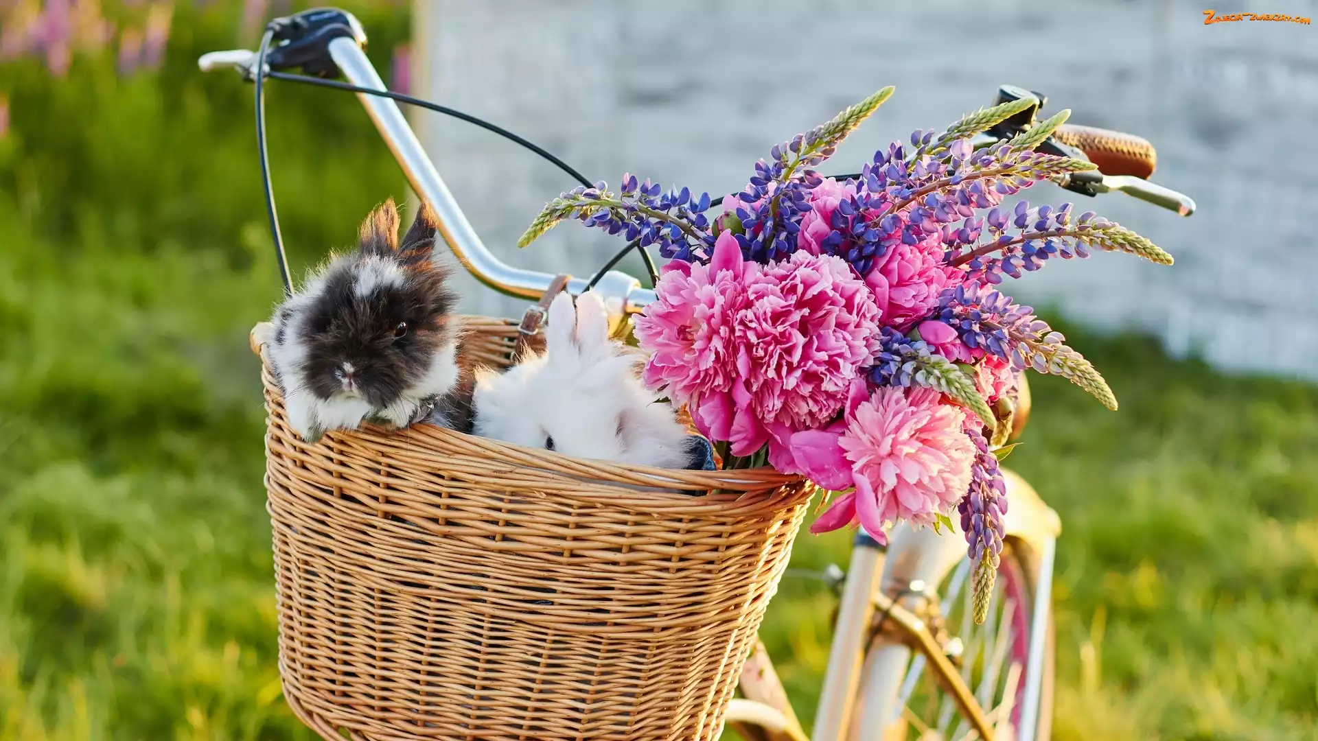 Rower, Łubin, Dwa, Koszyk, Wiklinowy, Kwiaty, Króliki, Piwonie