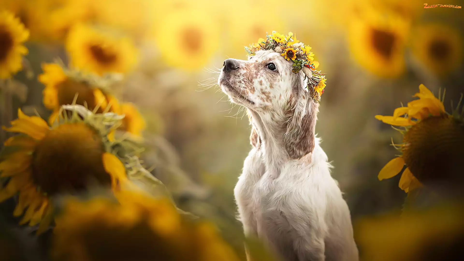 Zdjęcie: Wianek, Słoneczniki, Pies, Kwiaty