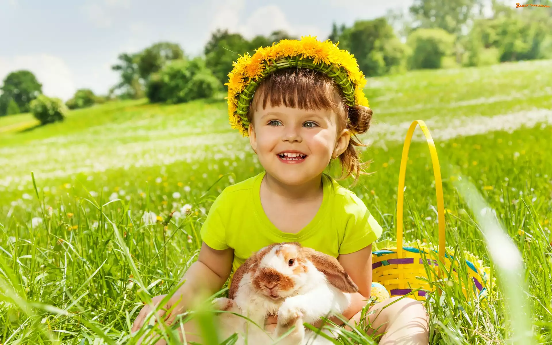 Zdjęcie: Wianuszek, Dziewczynka, Koszyk, Królik, Łąka, Mlecze