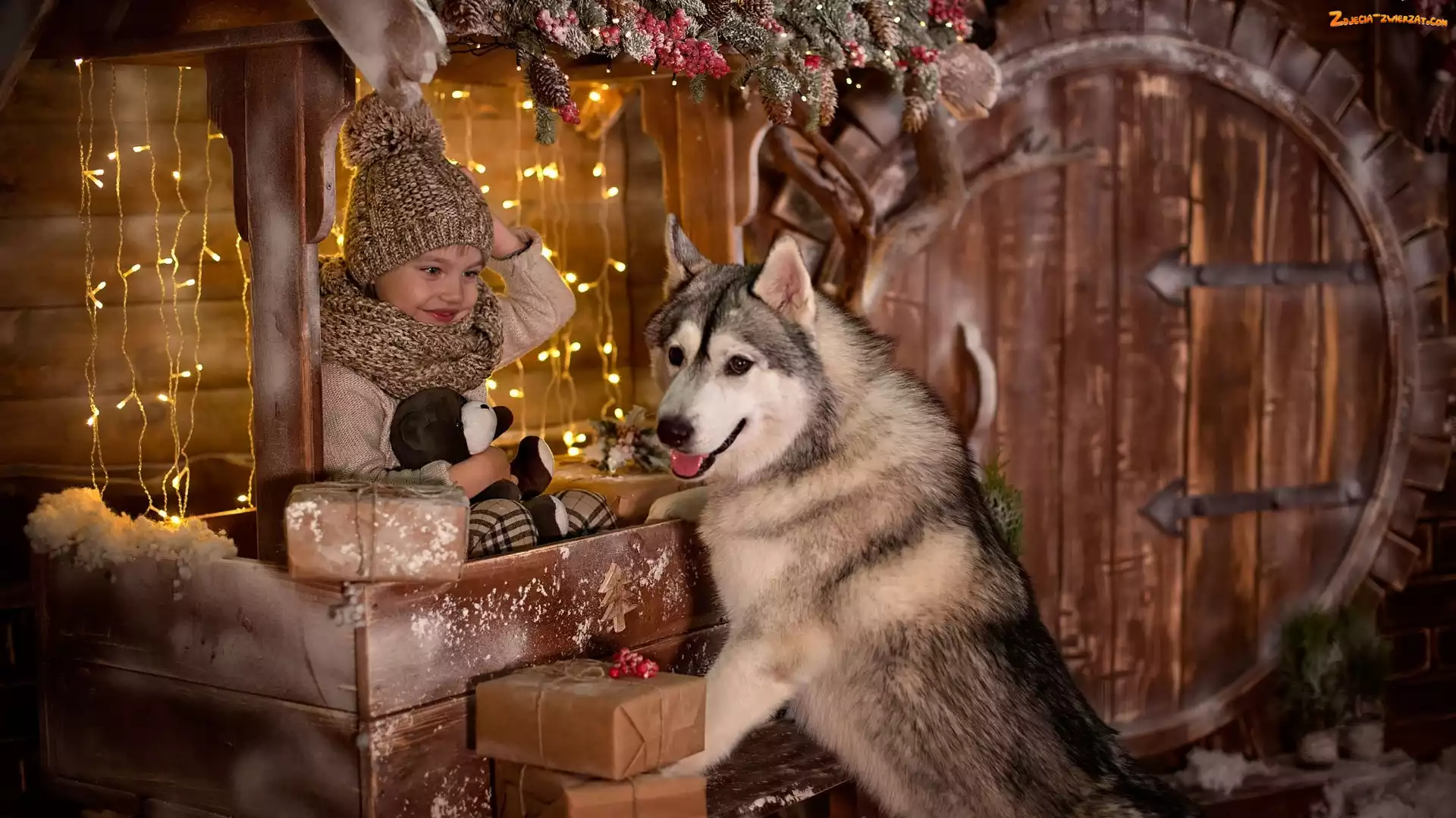 Zdjęcie: Światełka, Świątecznie, Pies, Dziecko, Siberian husky