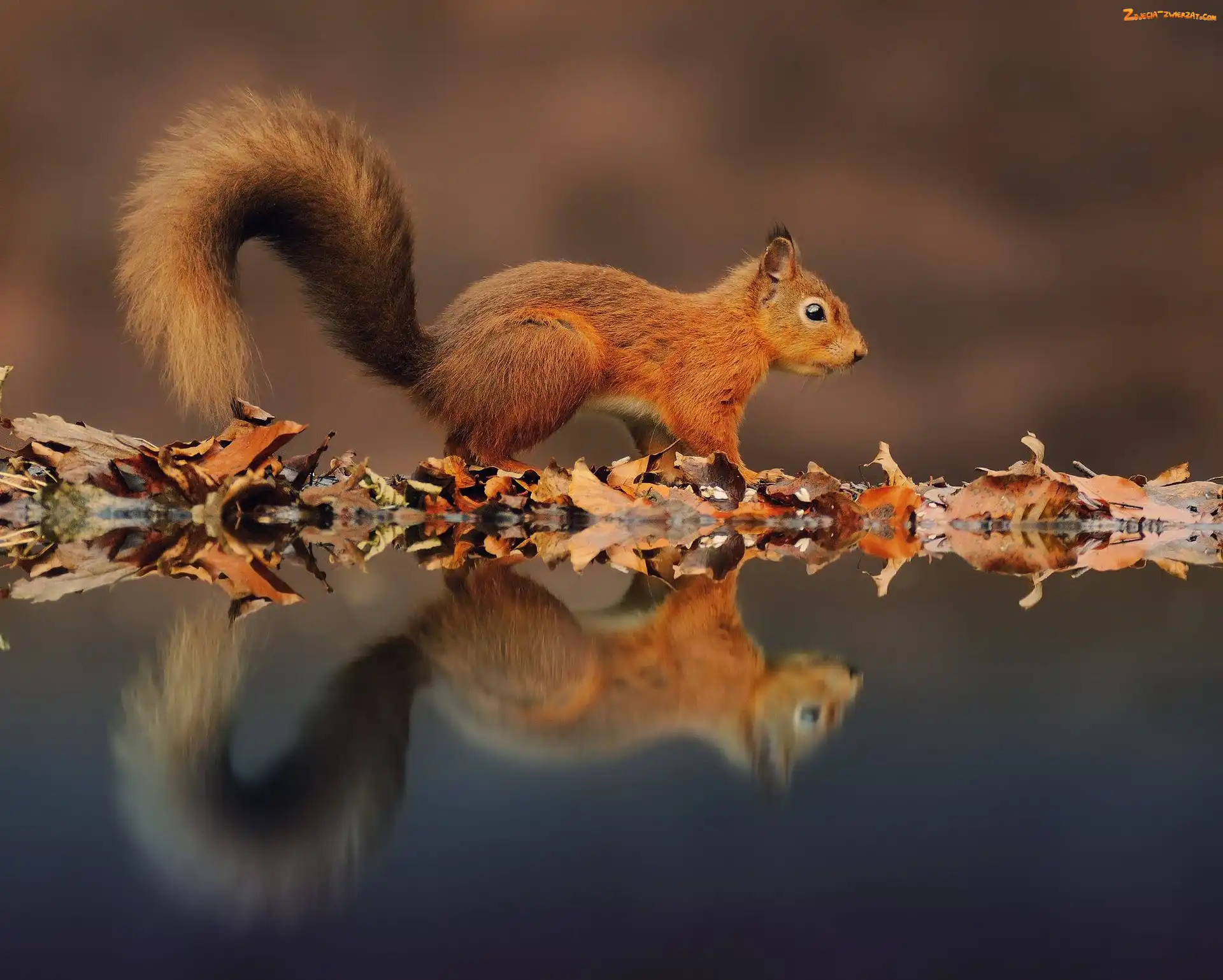 Zdjęcie: Wiewiórka, Odbicie, Ruda, Liście