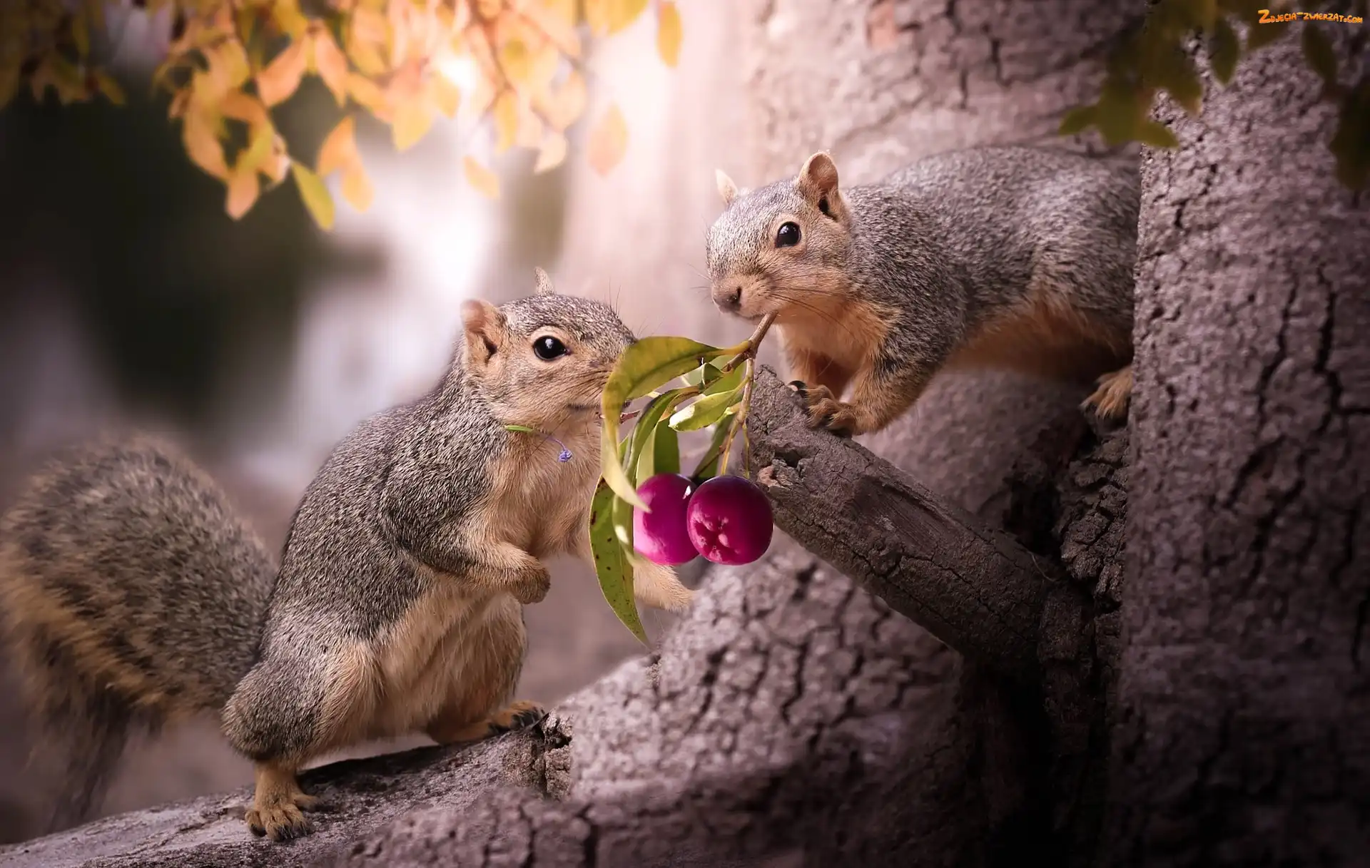 Światło, Jagody, Drzewo, Wiewiórki, Gałązka