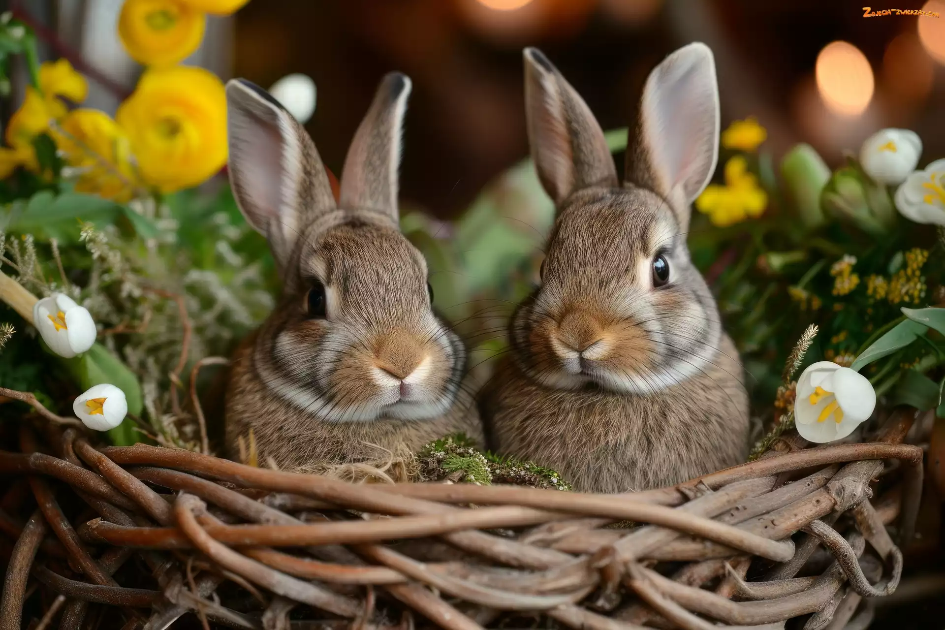 Zdjęcie: Gniazdo, Wiklinowe, Kwiaty, Dwa, Króliki