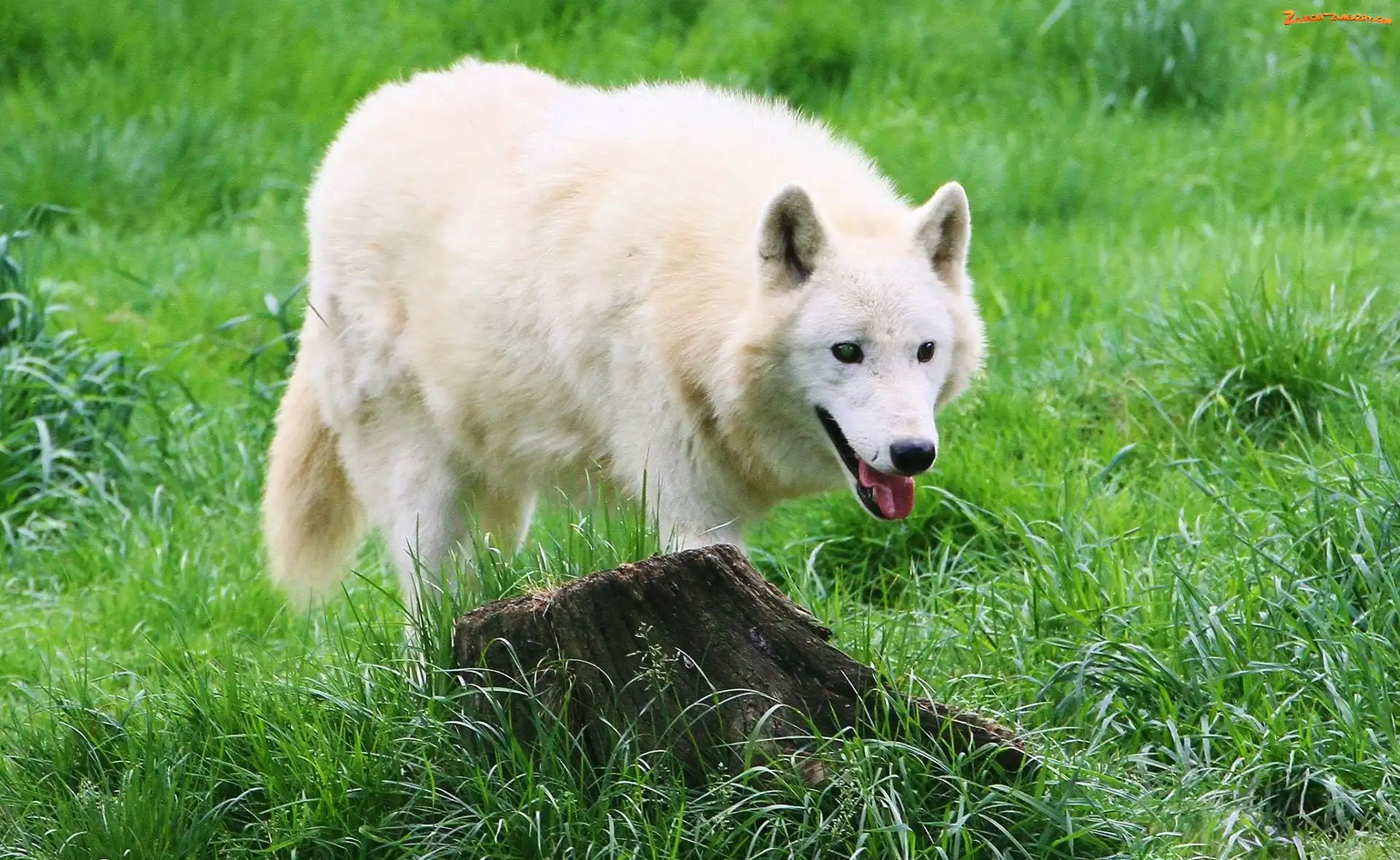 Zdjęcie: Wilk, Trawa, Biały, Pniak