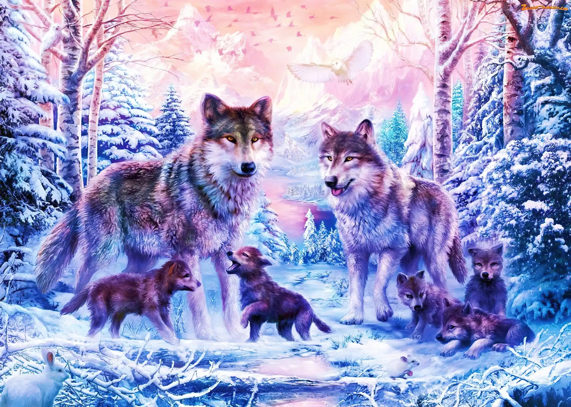 Zdjęcie: Drzewa, Wilki, Śnieg