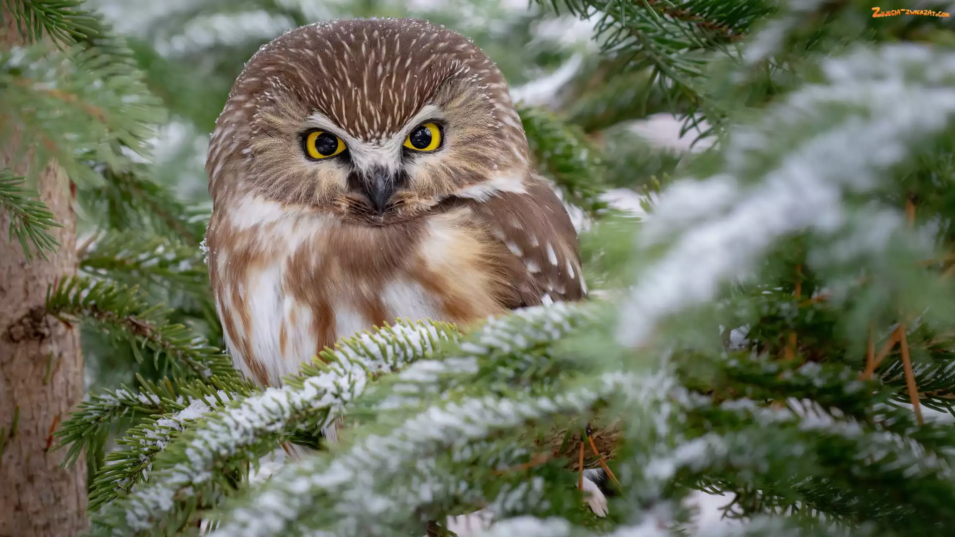 Zdjęcie: Gałązki, Drzewo, Sowa, Włochatka, Świerk, Ośnieżone