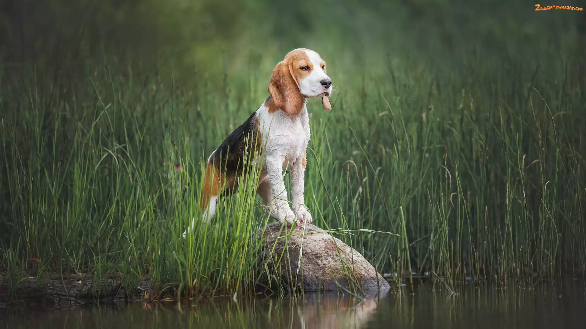 Zdjęcie: Trawa, Woda, Kamień, Pies, Beagle
