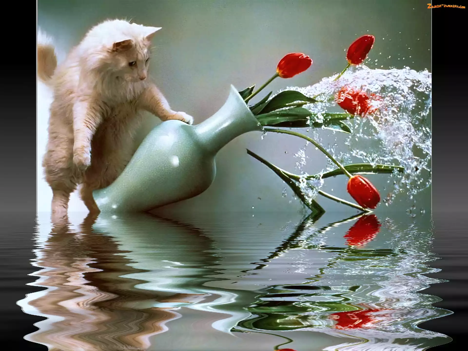 Zdjęcie: Tulipany, Wazon, Woda, Kot, Rozrabiaka