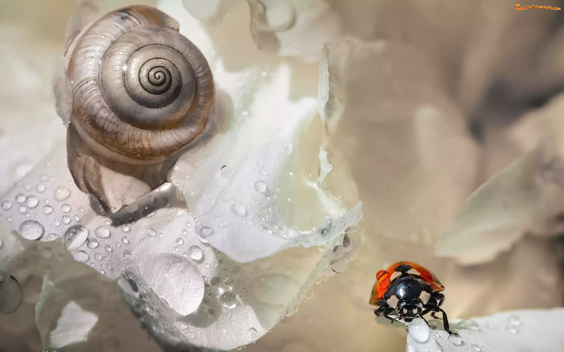 Zdjęcie: Woda, Kwiat, Biedronka, Ślimak, Krople, Biały