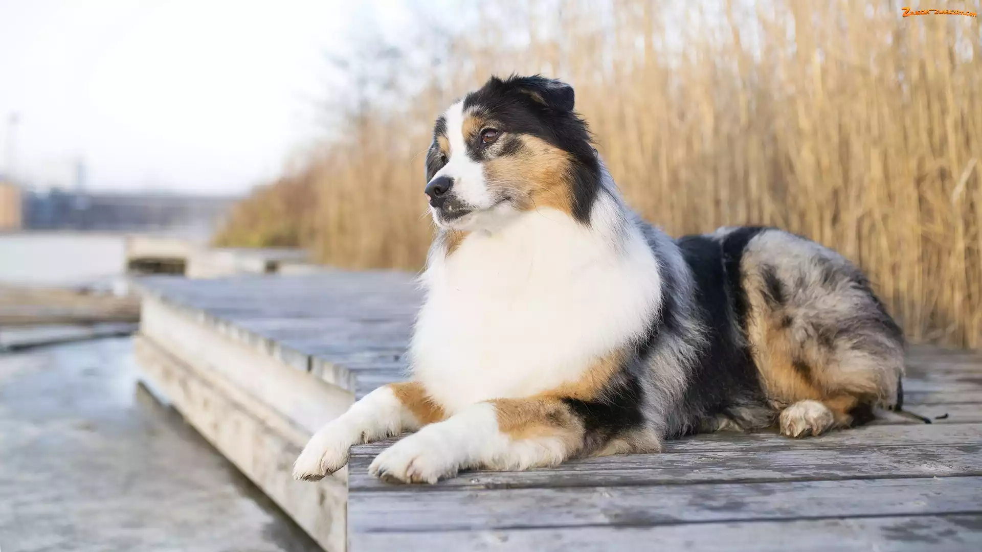 Zdjęcie: Woda, Trawy, Owczarek australijski, Pies, Pomost