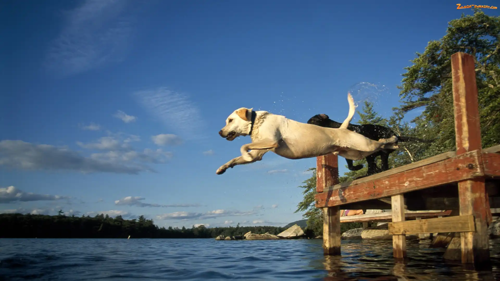 Zdjęcie: Woda, Skok, Psy, Pomost