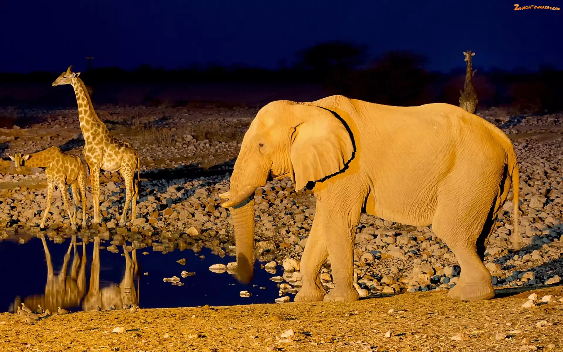 Zdjęcie: Wodopój, Żyrafy, Afryka, Namibia, Słoń, Noc