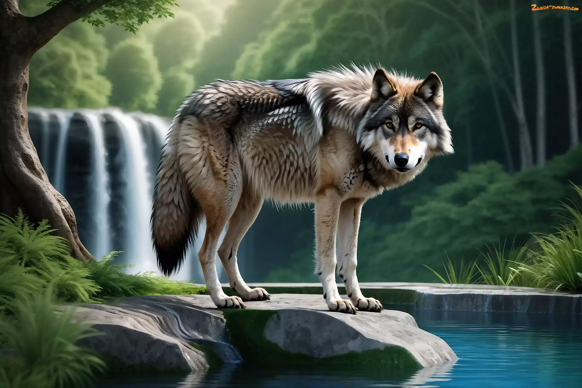 Zdjęcie: Las, Wodospad, Grafika, Wilk, Skała