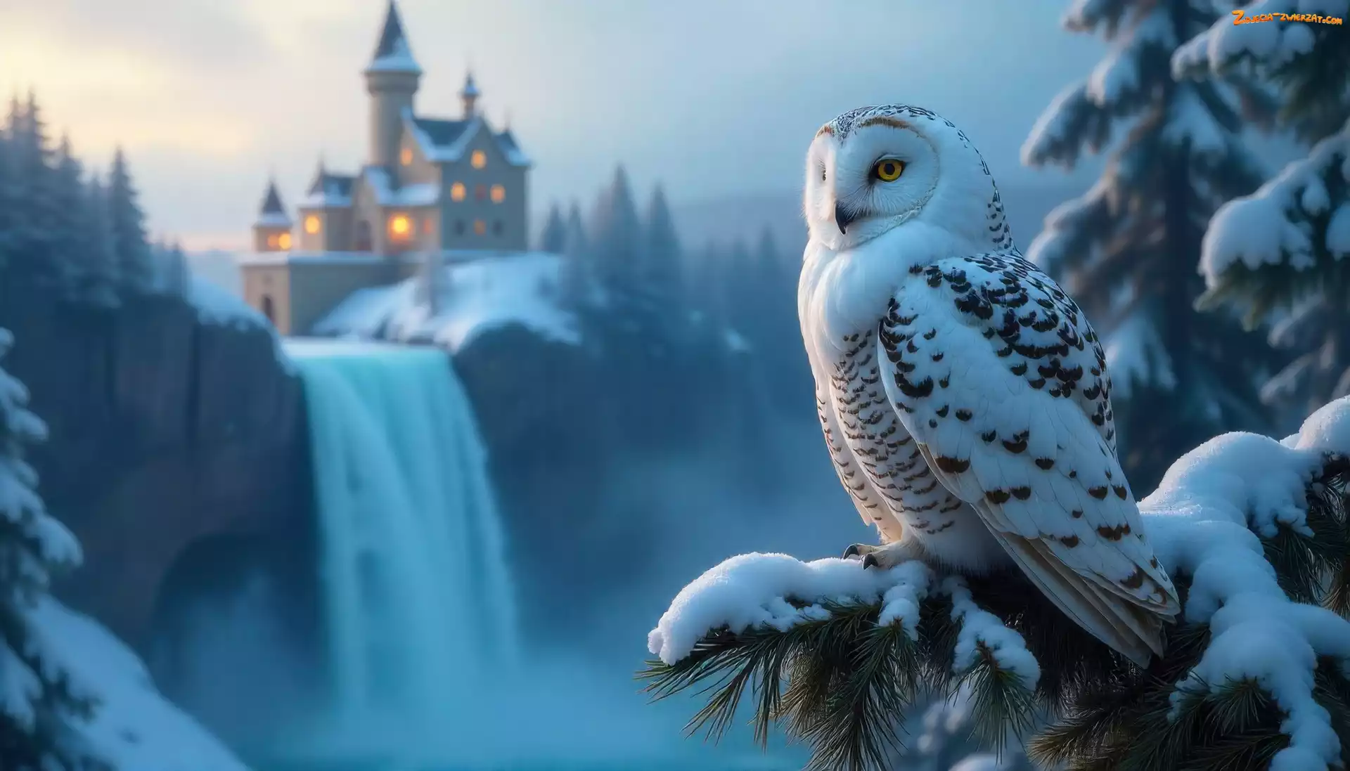 Zdjęcie: Sowa śnieżna, Świerk, Wodospad Grafika AI, Zamek
