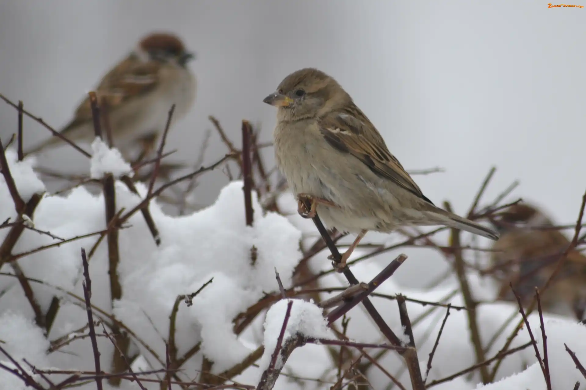 Zdjęcie: Śnieg, Wróble, Gałązki