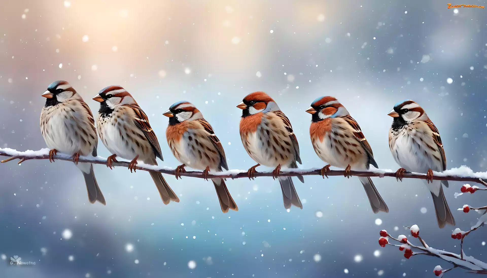 Zdjęcie: Gałązka, Sześć, Ptaków, Wróblowate, Grafika, Ptaki, Śnieg