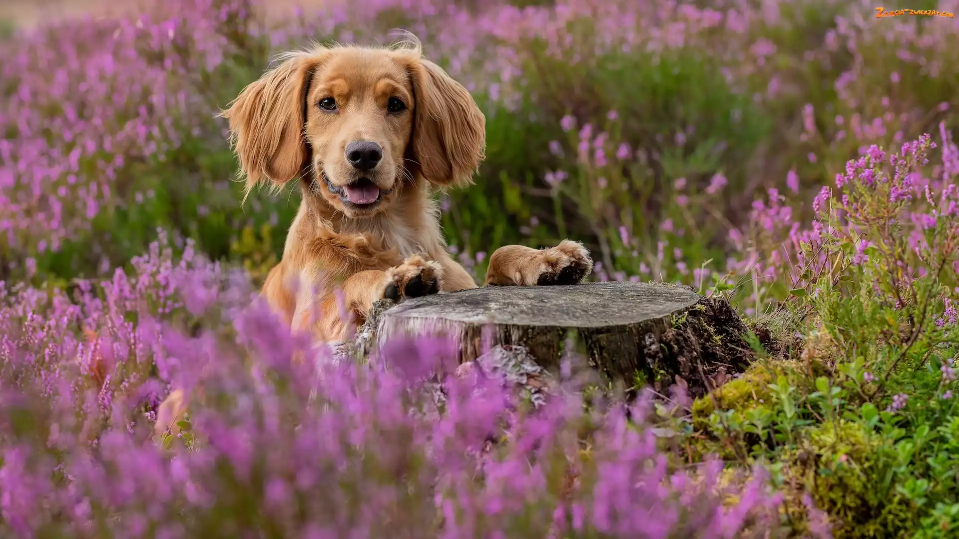 Zdjęcie: Pień, Wrzosy, Working cocker spaniel, Pies, Kwiaty