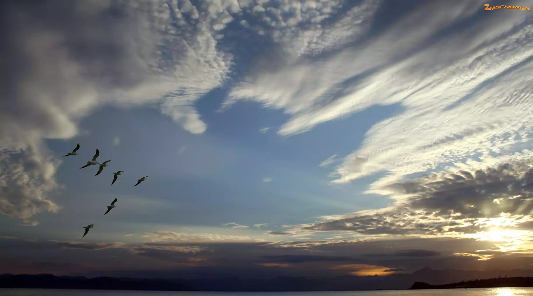 Zdjęcie: Wschód, Niebo, Ptaków, Klucz, Chmury, Słońca