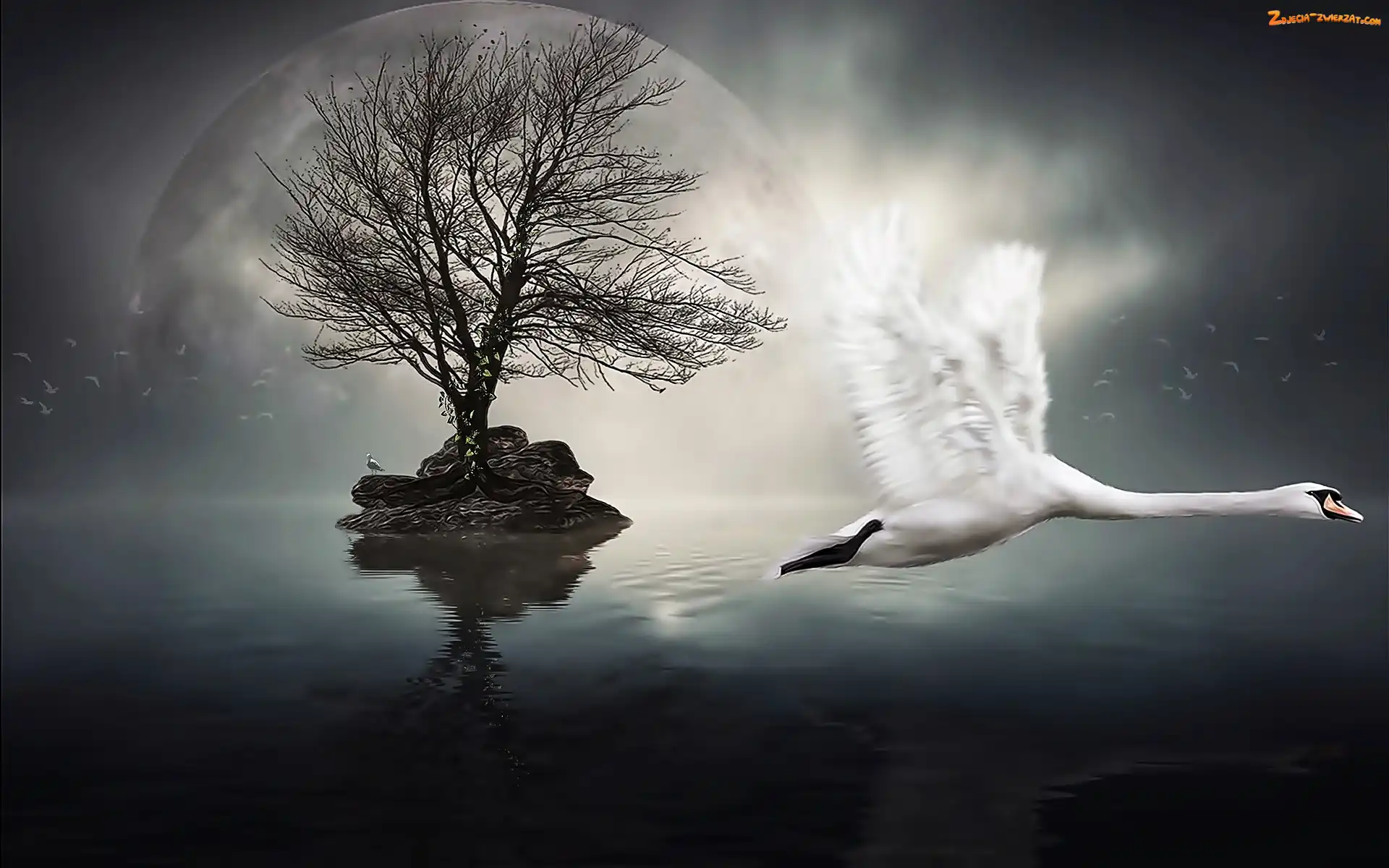 Wyspa, Łabędź, Fantasy, Woda, Mewy, Drzewo