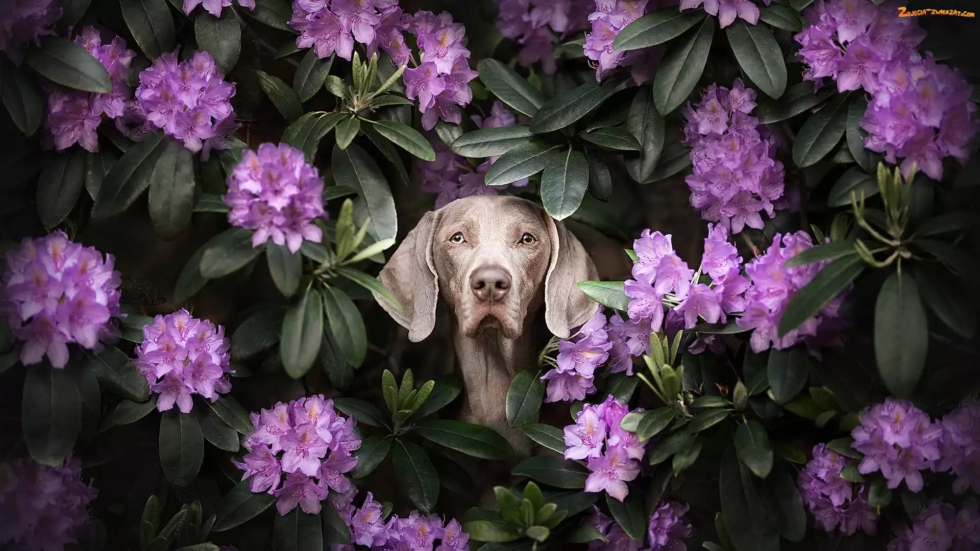 Zdjęcie: Pies, Wyżeł weimarski, Różanecznik, Kwiaty