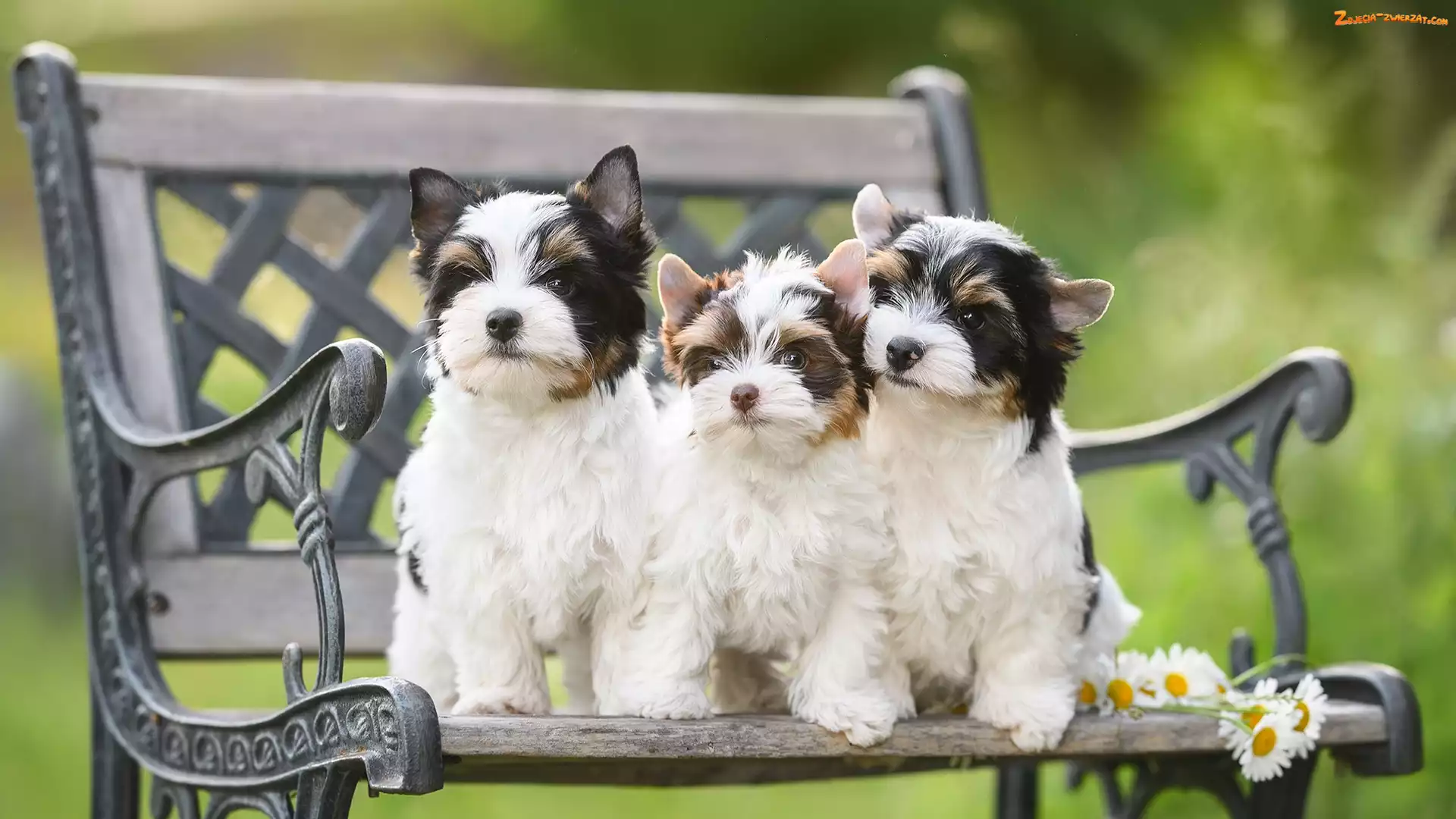 Zdjęcie: Trzy, Szczeniaki, Ławka, Yorkshire terrier biewer