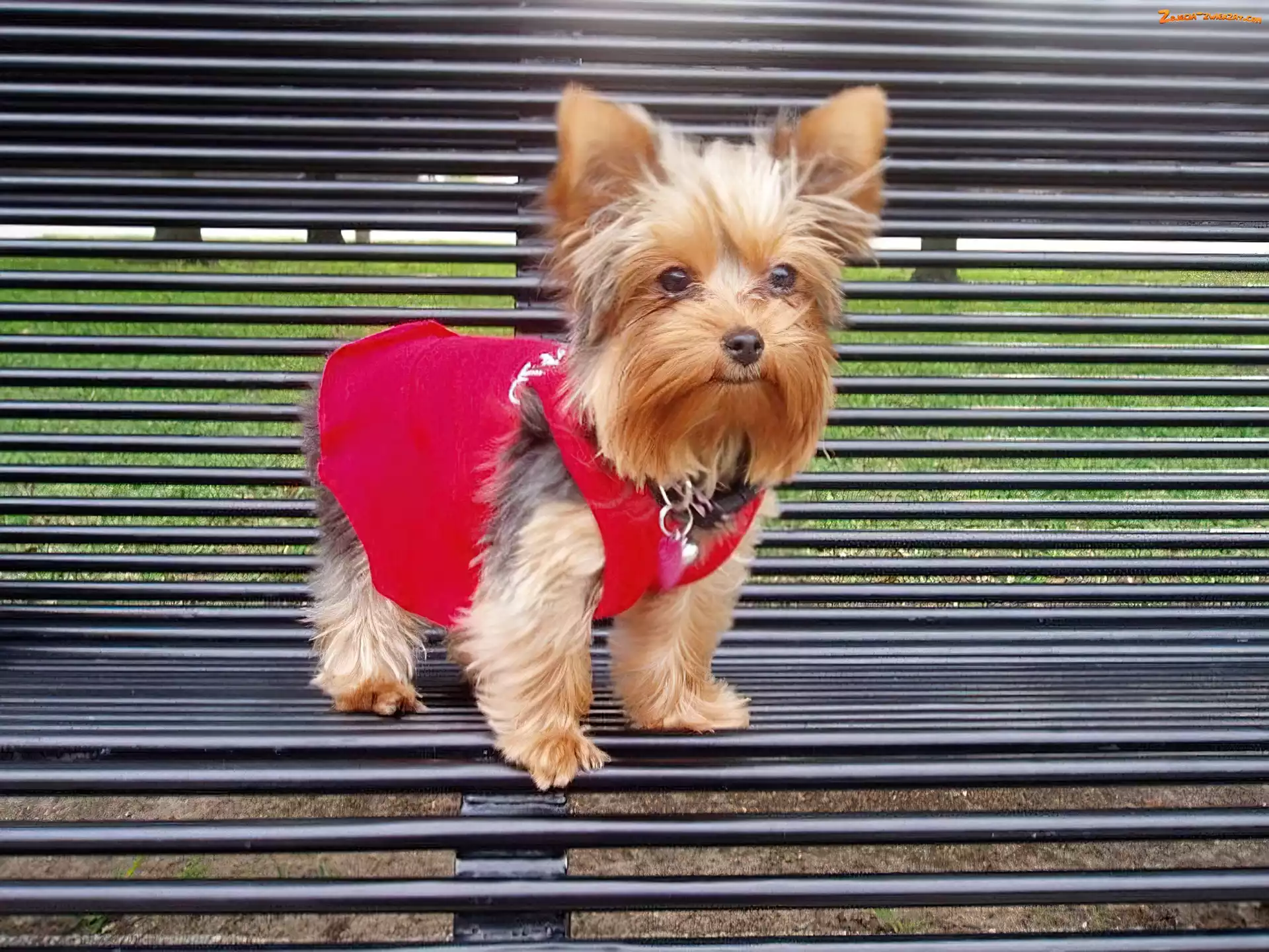 Zdjęcie: Yorkshire Terrier, ławka, ubrany, metalowa