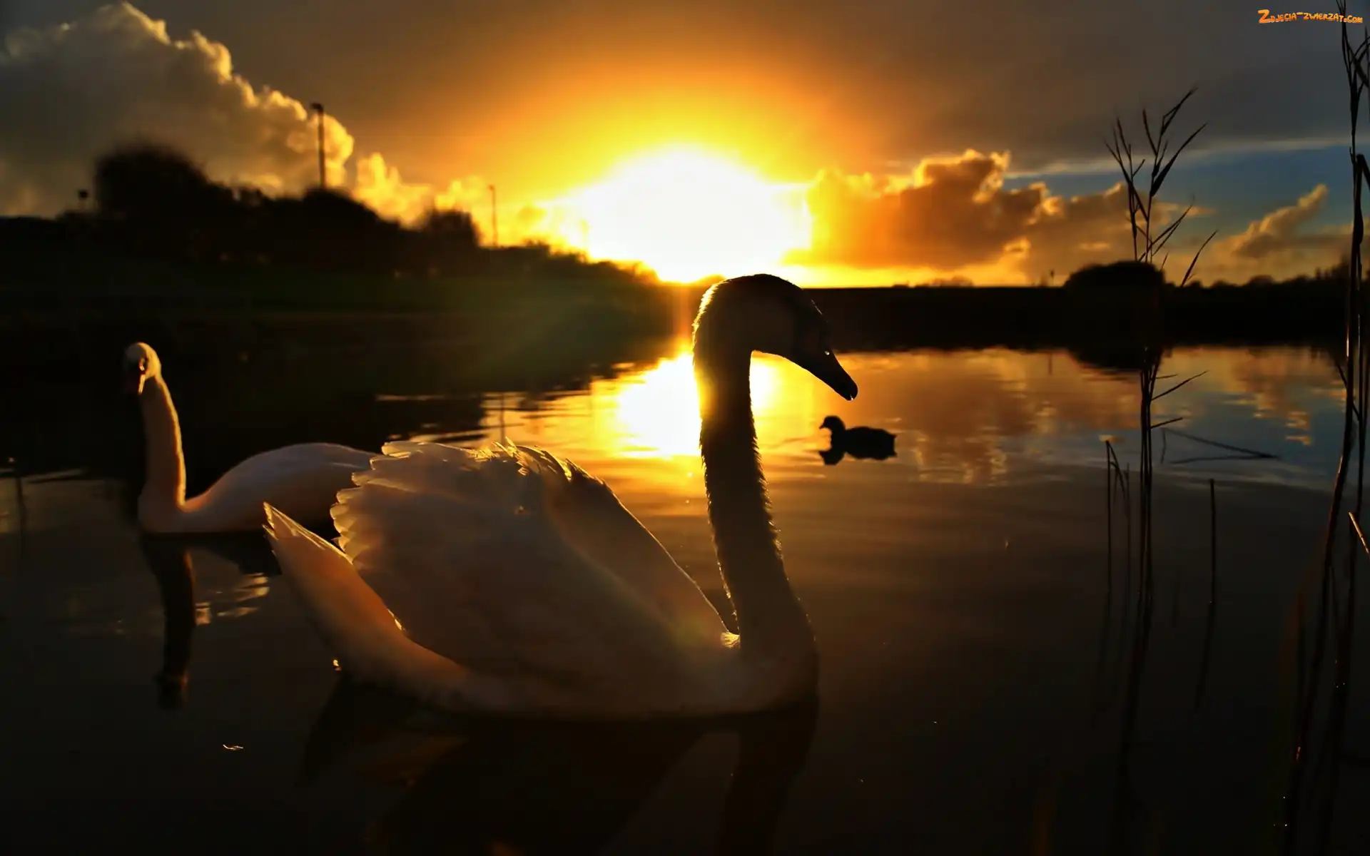 Zdjęcie: Zachód Słońca, Jezioro, Para, Łabędzie, Młode