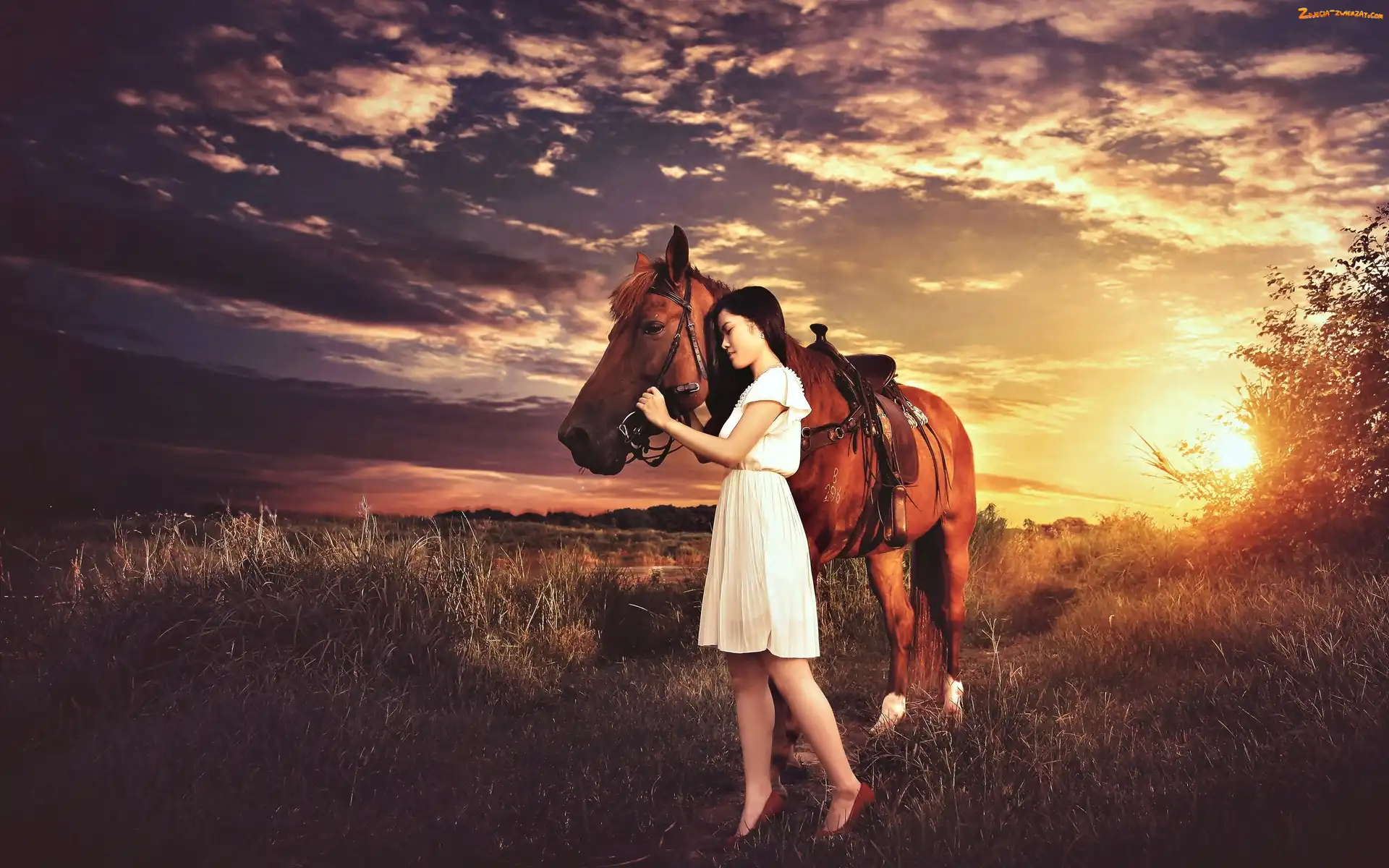 Zdjęcie: Zachód, Kobieta, Chmury, Pole, Koń, Słońca