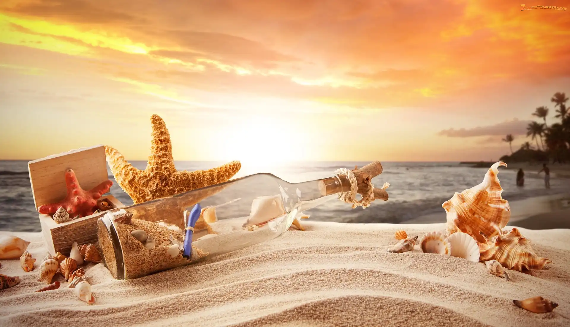 Plaża, Zachód słońca, Rozgwiazdy, Butelka, Morze, Muszelki