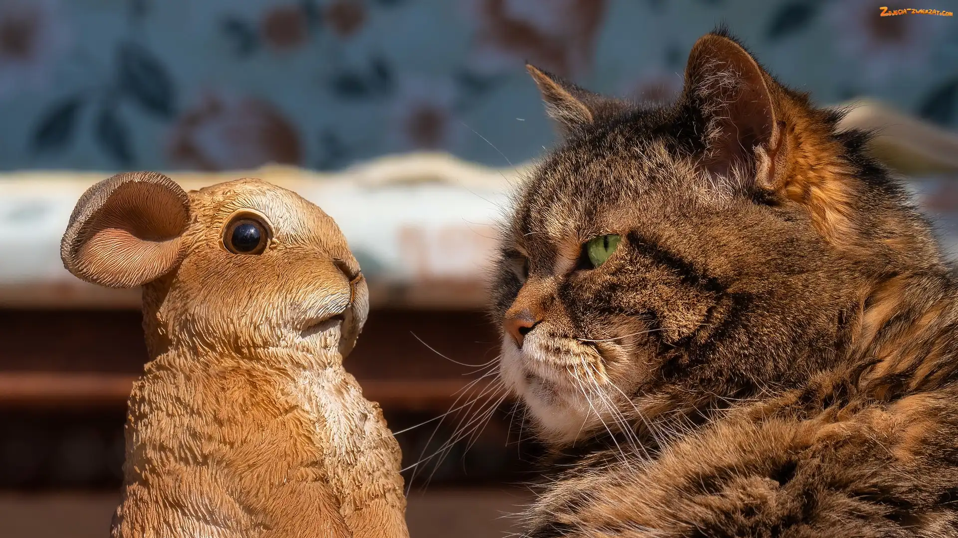 Zajączek, Figurka, Bury, Zapatrzony, Kot