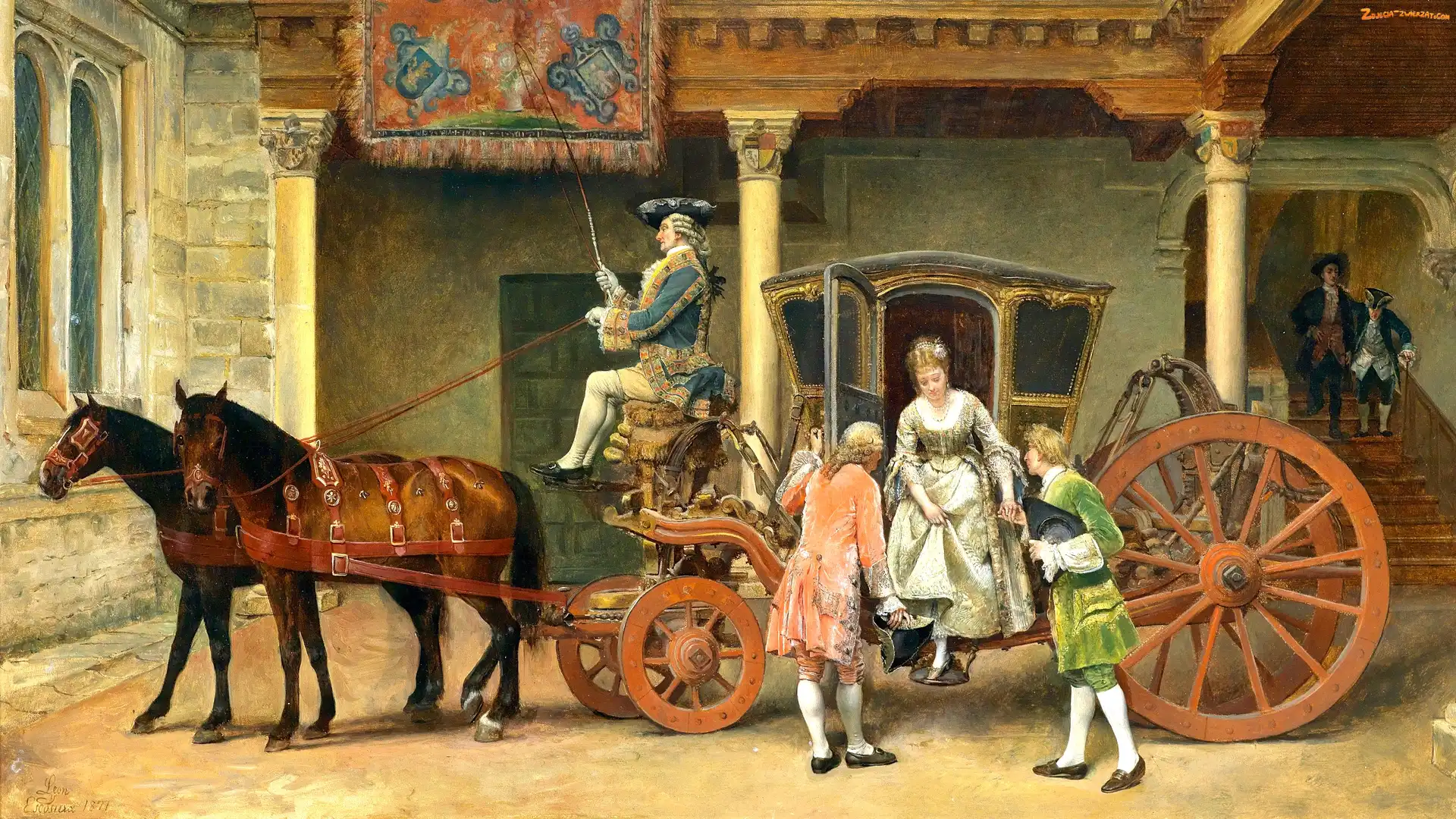 Zdjęcie: Zaprzęg konny, Mężczyźni, Konie, Malarstwo, Kobieta, Woźnica, Ignacio Leon y Escosura, Obraz, Karoca |