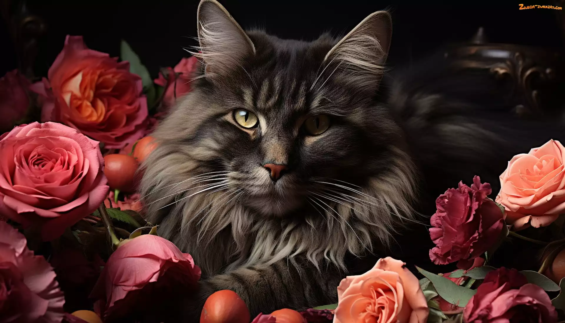 Zdjęcie: Kot, Ciemny, Róże, Zbliżenie