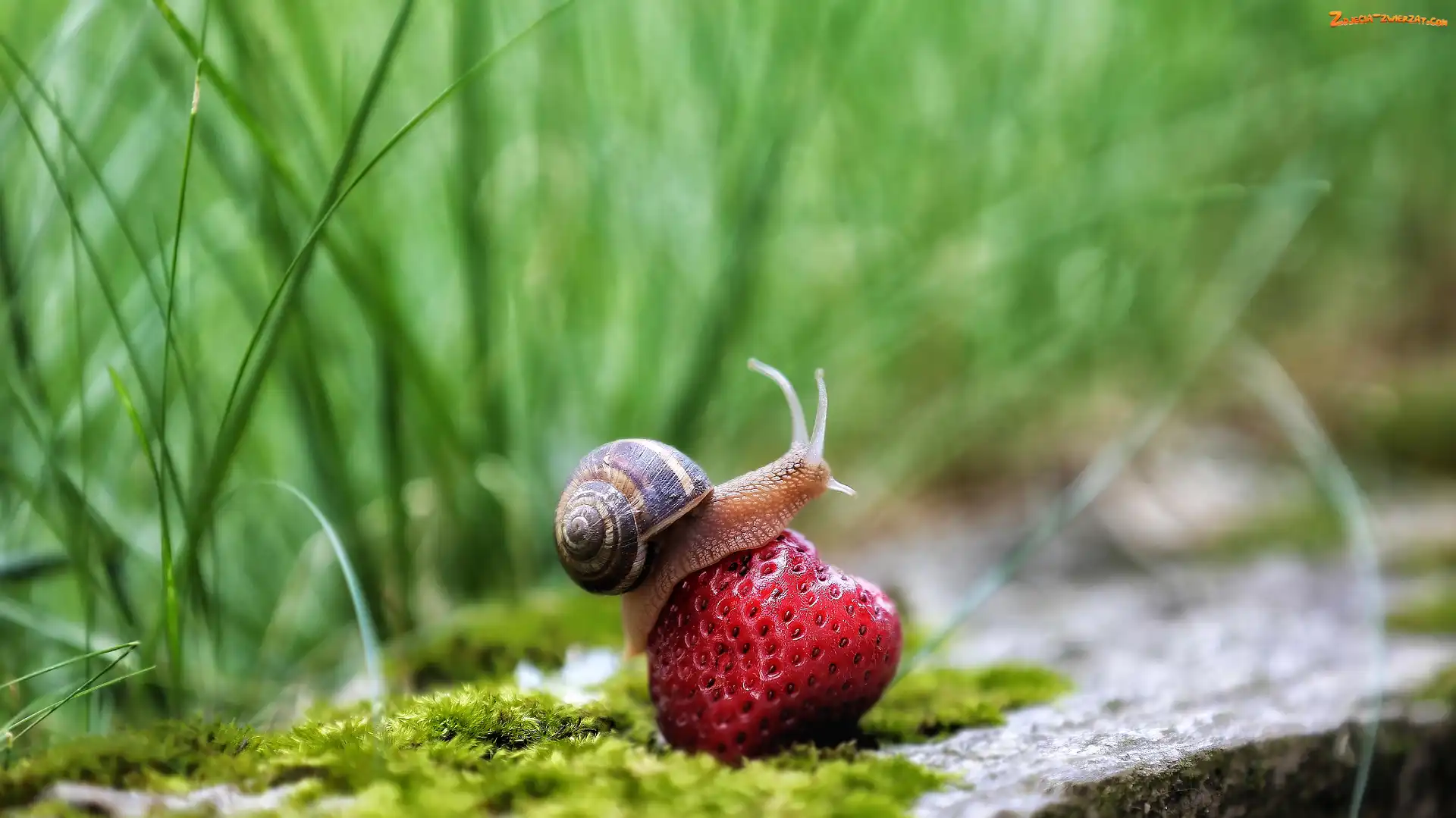 Zdjęcie: Zbliżenie, Mech, Truskawka, Ślimak, Trawa