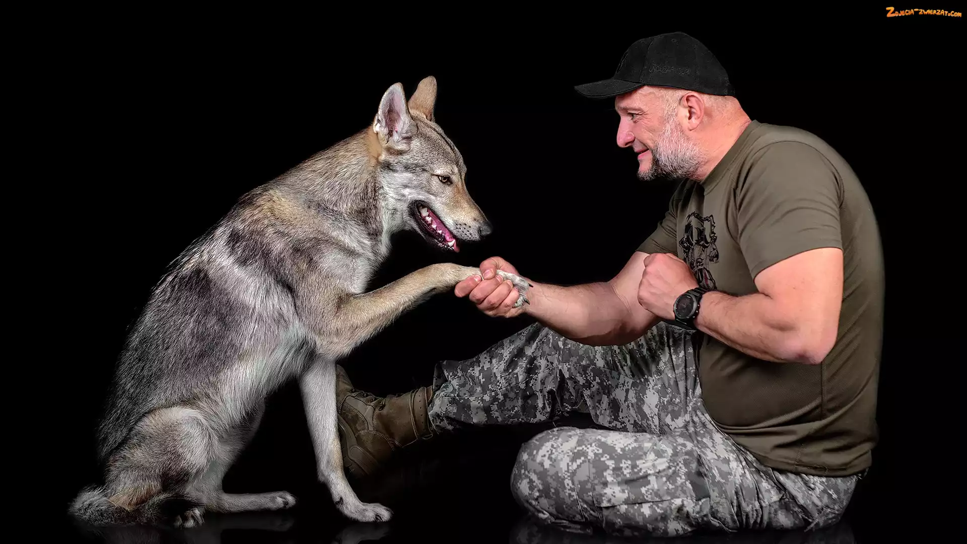 Zdjęcie: Łapa, Broda, Mężczyzna, Pies, Wilczak czechosłowacki, Czapka, Zegarek