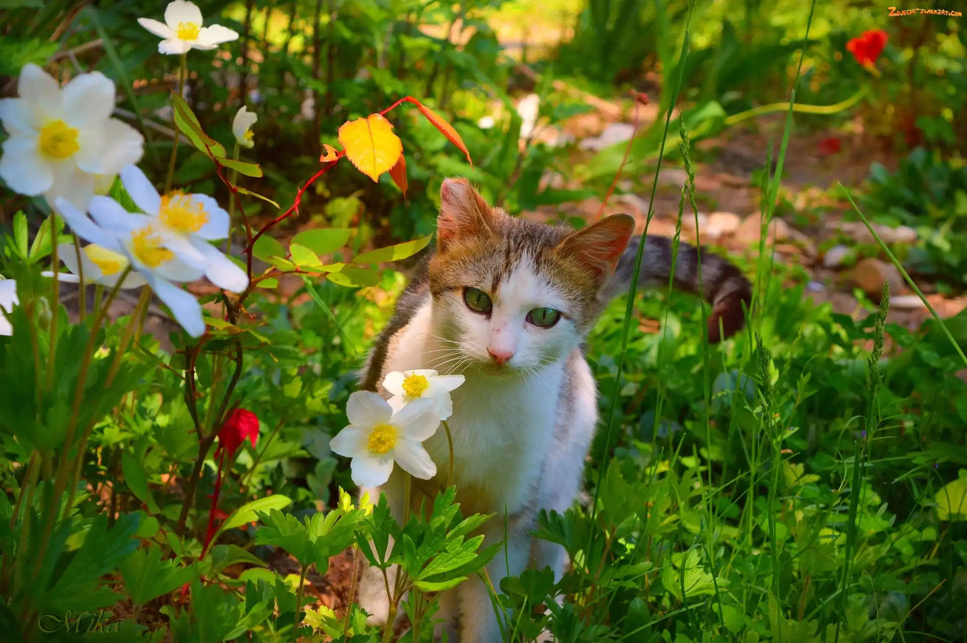 Zdjęcie: Zielone, Kwiaty, Kotek, Oczy