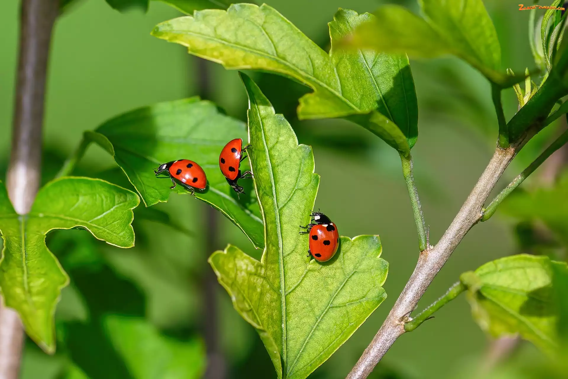 Zdjęcie: Trzy, Biedronki, Liście, Zielone