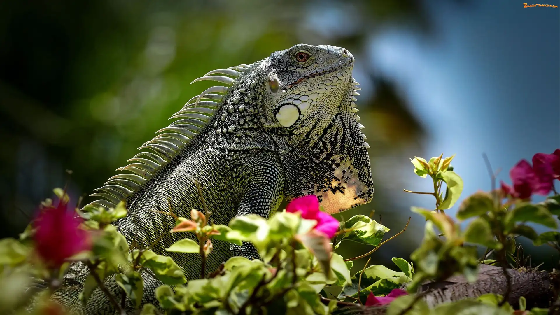 Zdjęcie: Legwan zielony, Iguana, Kwiaty, Jaszczurka