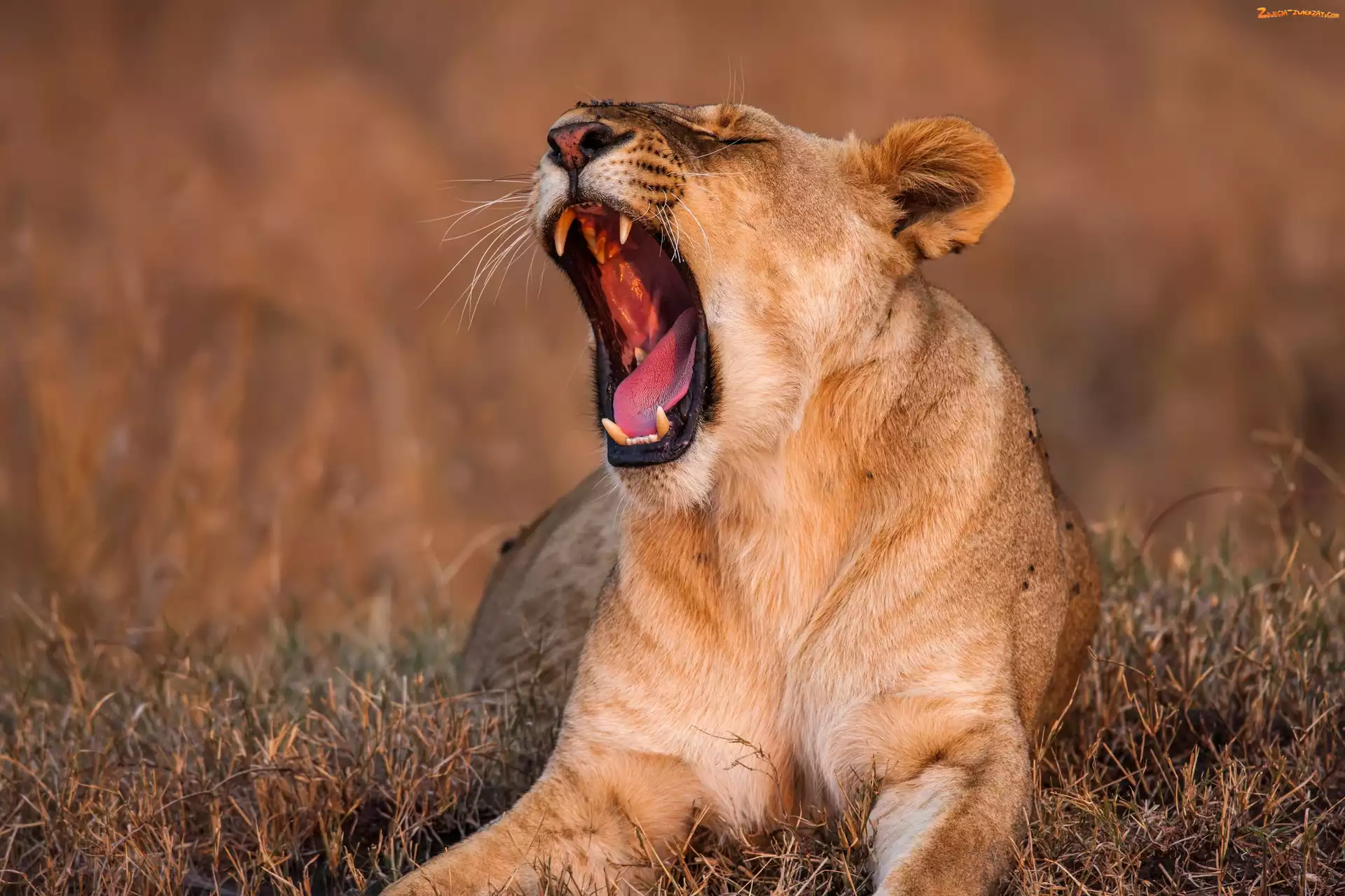 Zdjęcie: Trawa, Ziewająca, Lwica