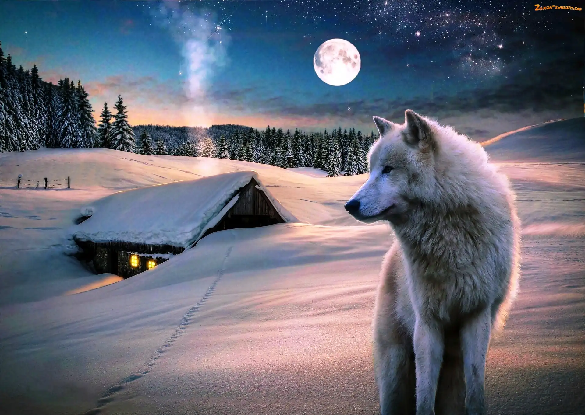 Zdjęcie: Zima, Wilk, Fantasy, Księżyc, Dom, Las