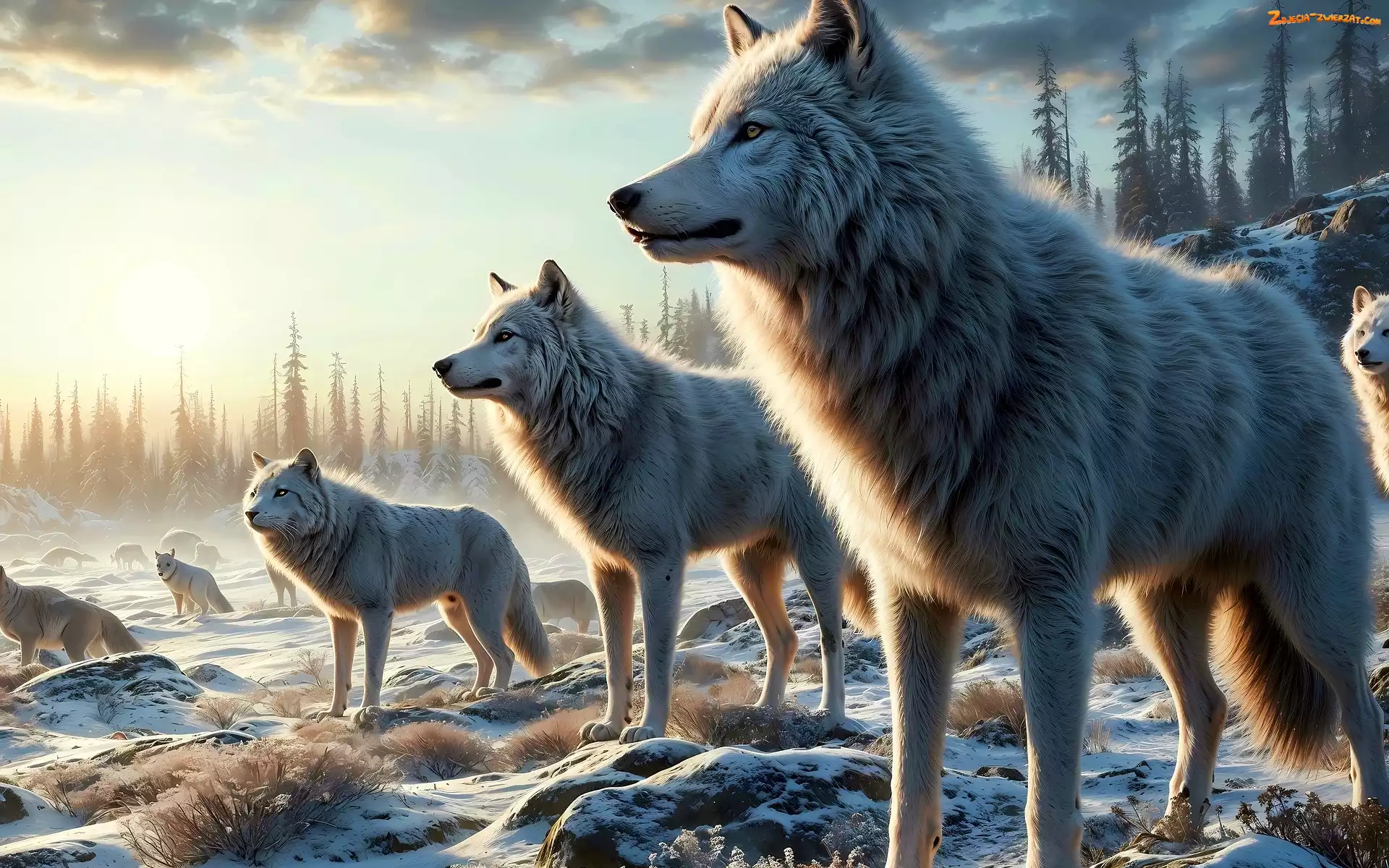 Zdjęcie: Poranek, Zima, Drzewa, Wataha, Wilki
