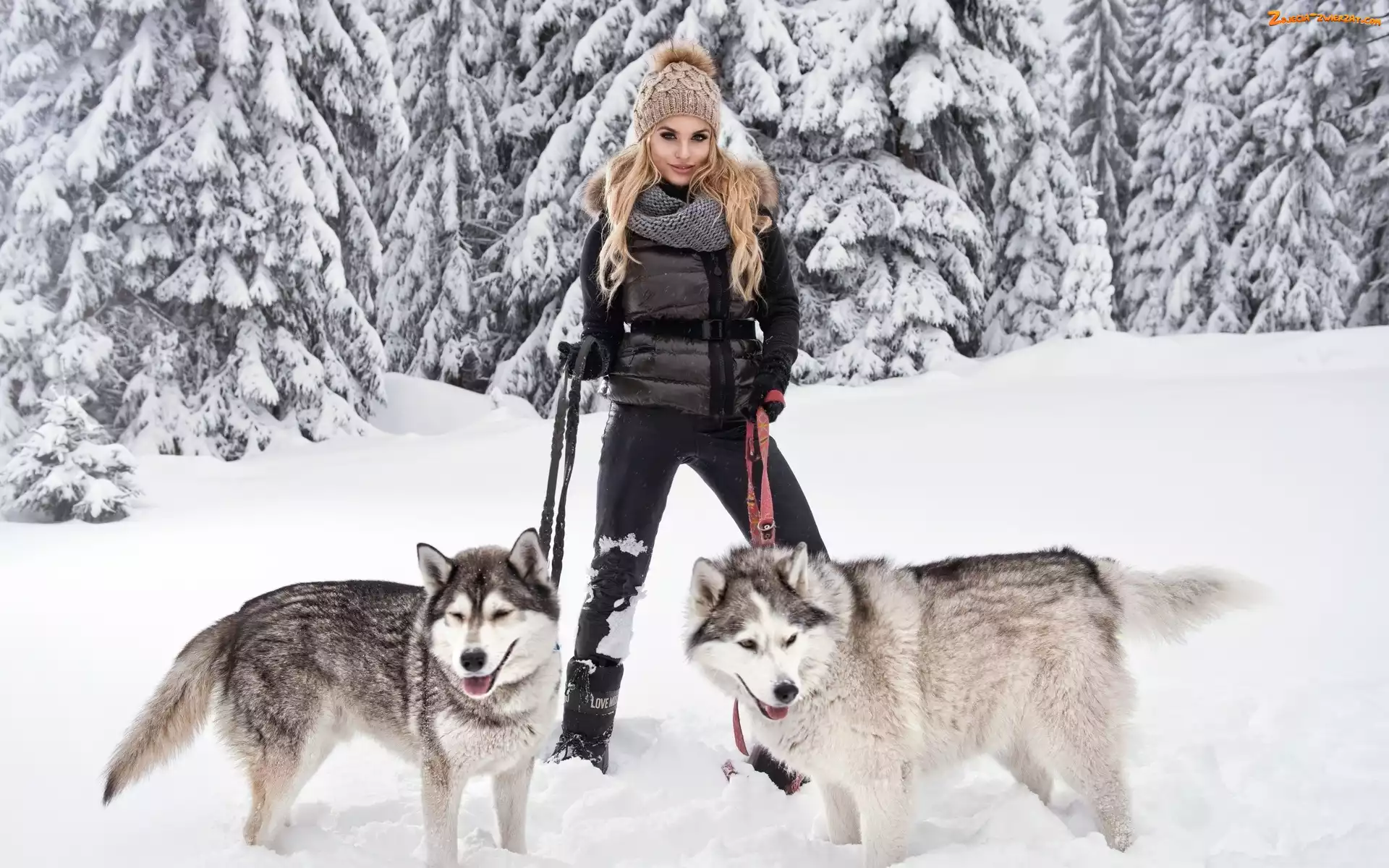 Zdjęcie: Dziewczyna, Zima, Siberian Husky, Psy, Las, Spacer