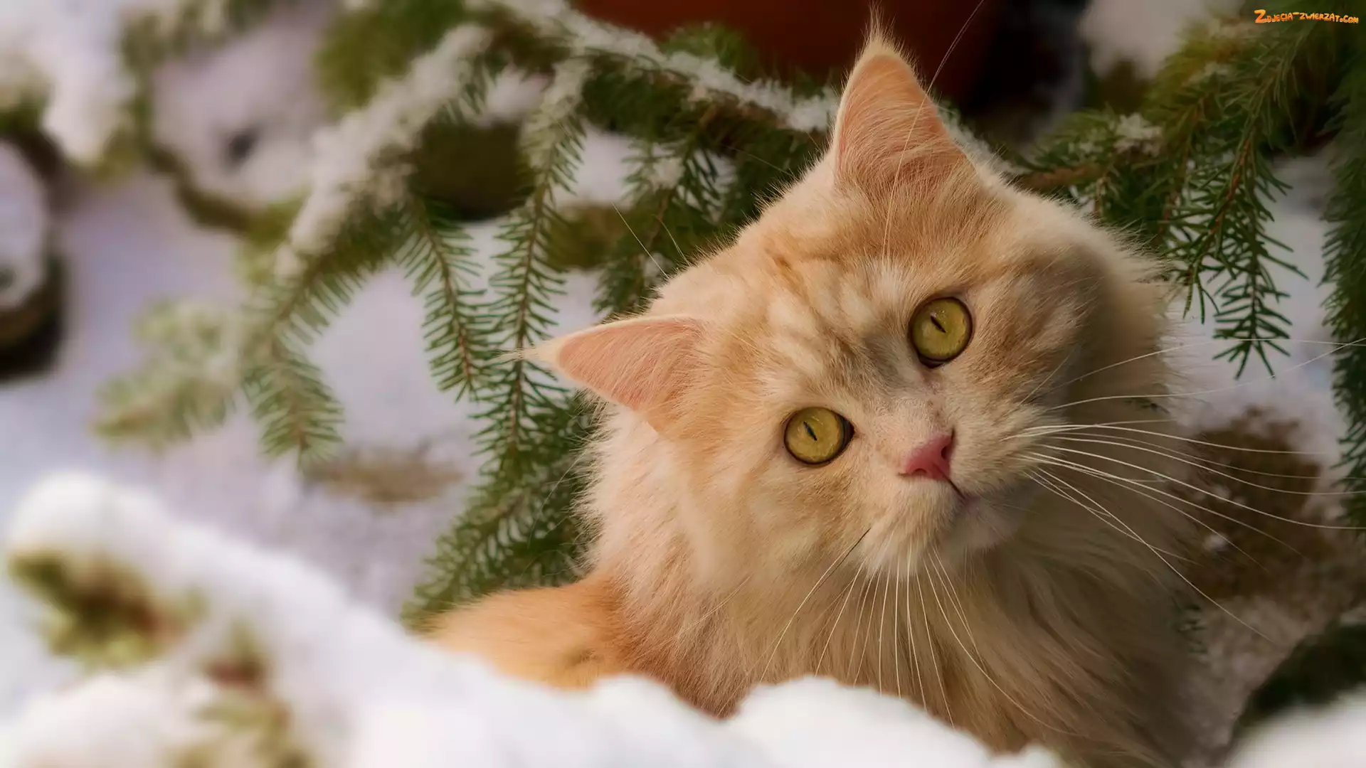 Zdjęcie: Zima, Rudy, Świerku , Gałązka, Kot, Śnieg
