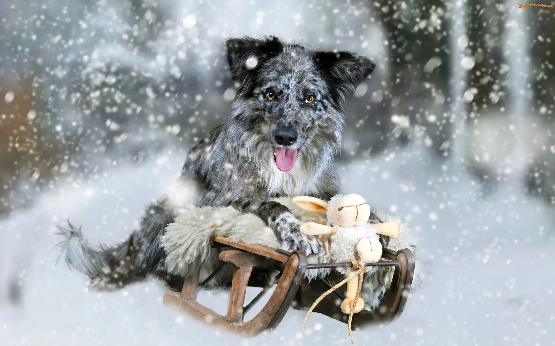 Zdjęcie: Sanki, Umaszczenie blue merle, Pies, Śnieg, Zabawka, Border collie, Zima