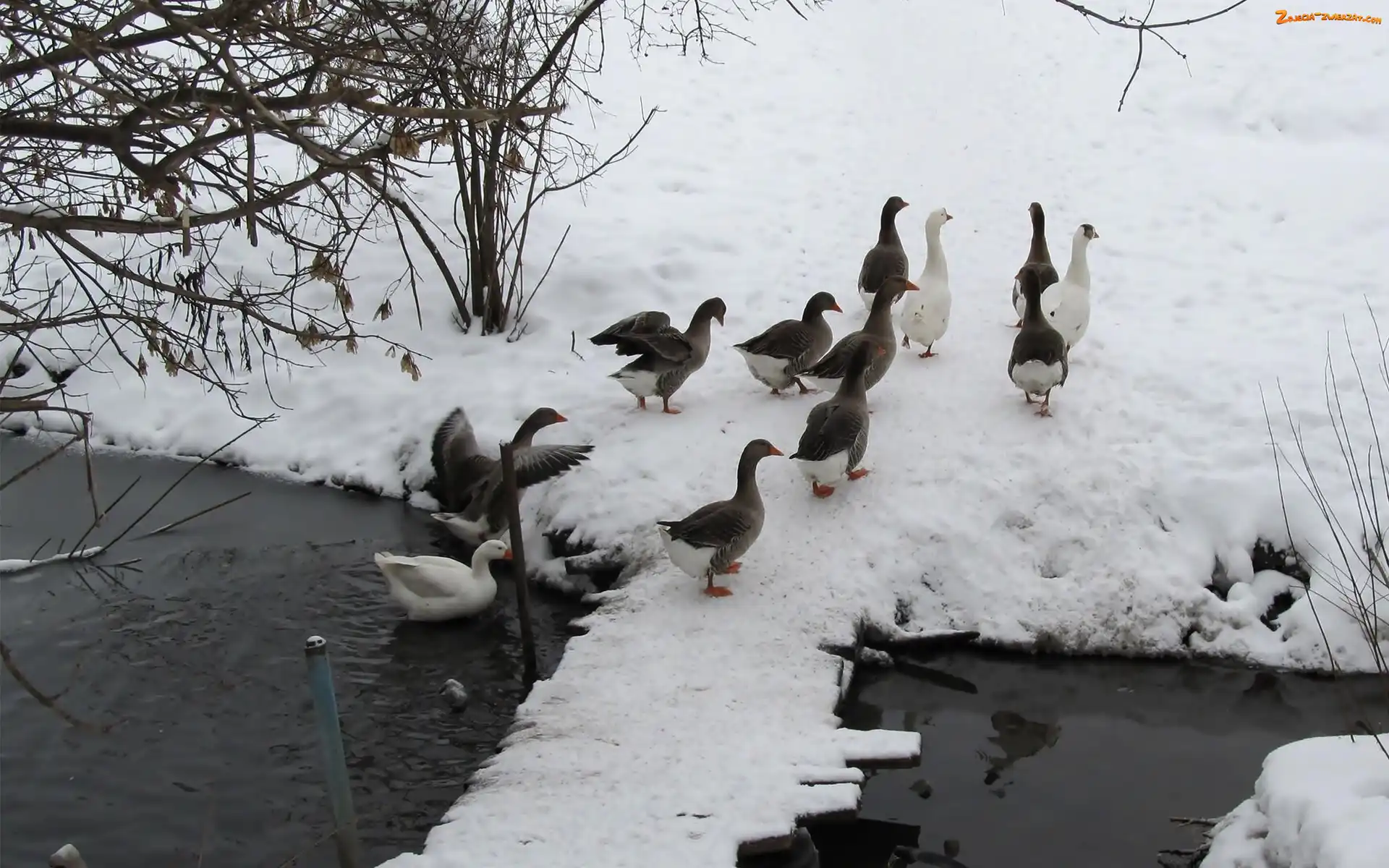 Zdjęcie: Zima, Śnieg, Gęsi, Stado, Staw