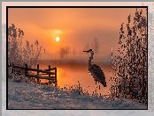 Zima, Czapla, Jezioro, Trzciny, Grafika AI, Szuwary, Zachód słońca