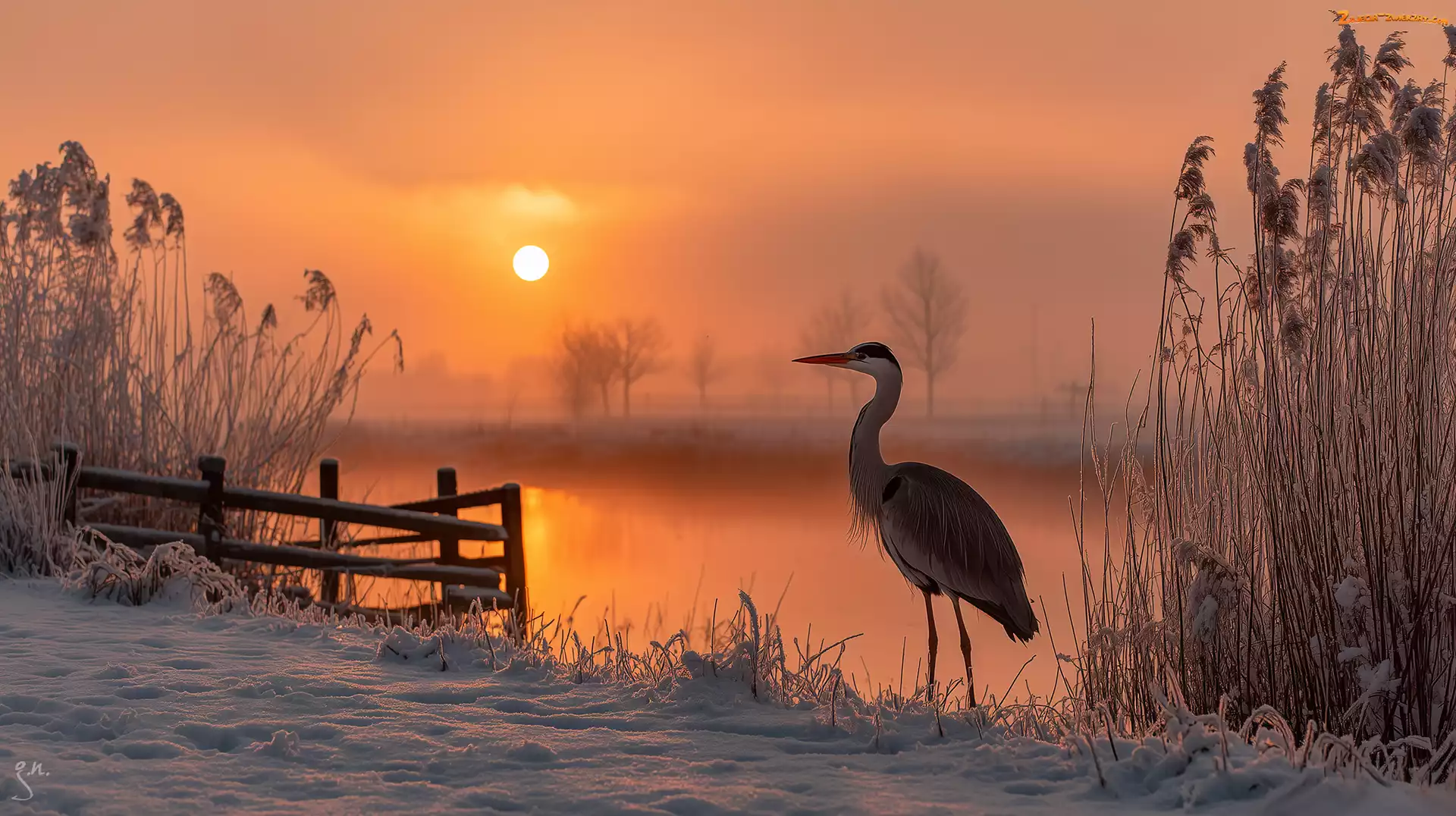 Zdjęcie: Zima, Czapla, Jezioro, Trzciny, Grafika AI, Szuwary, Zachód słońca