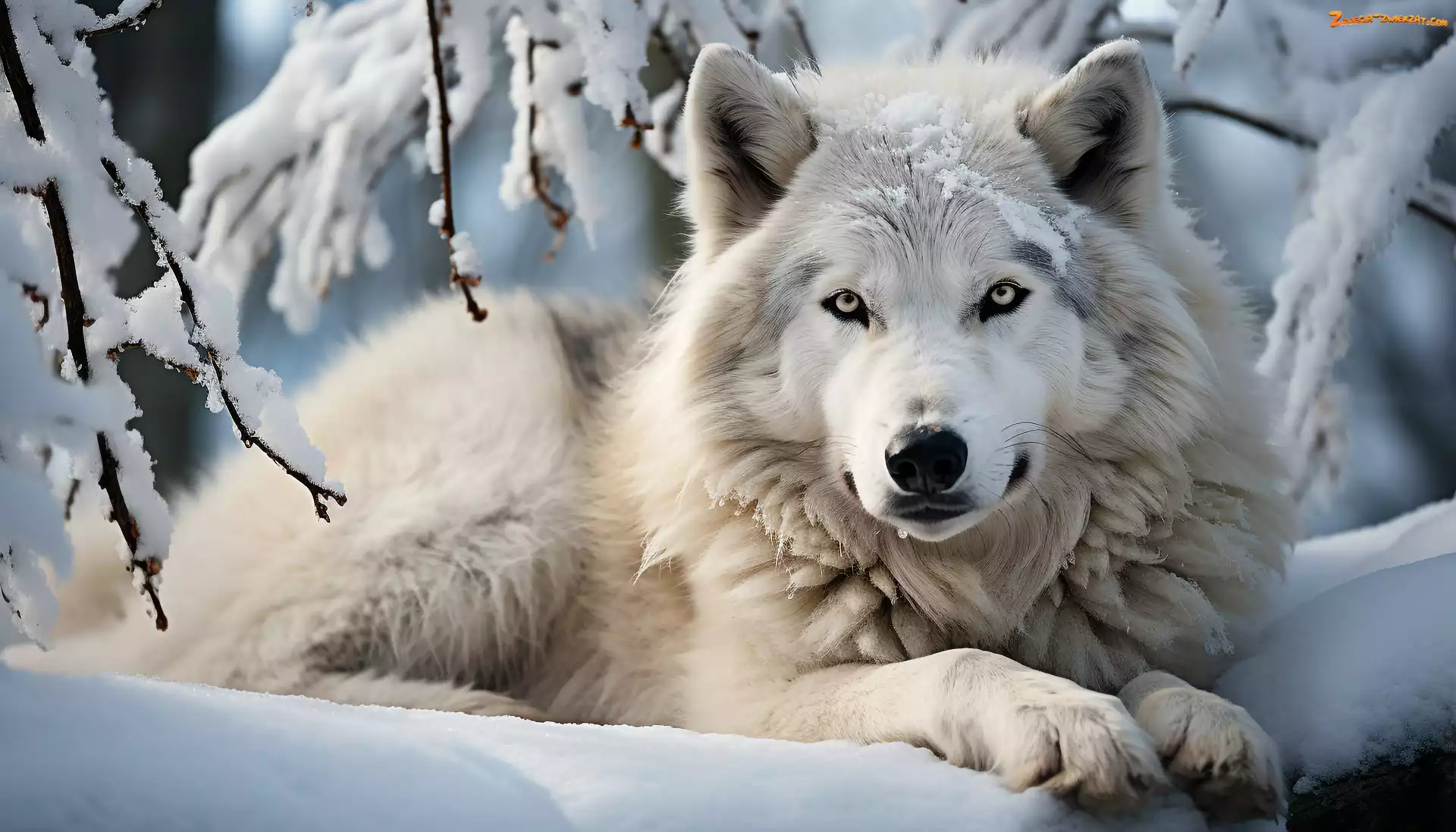 Zdjęcie: Grafika AI, Wilk, Zima, Leżący, Śnieg, Gałązki