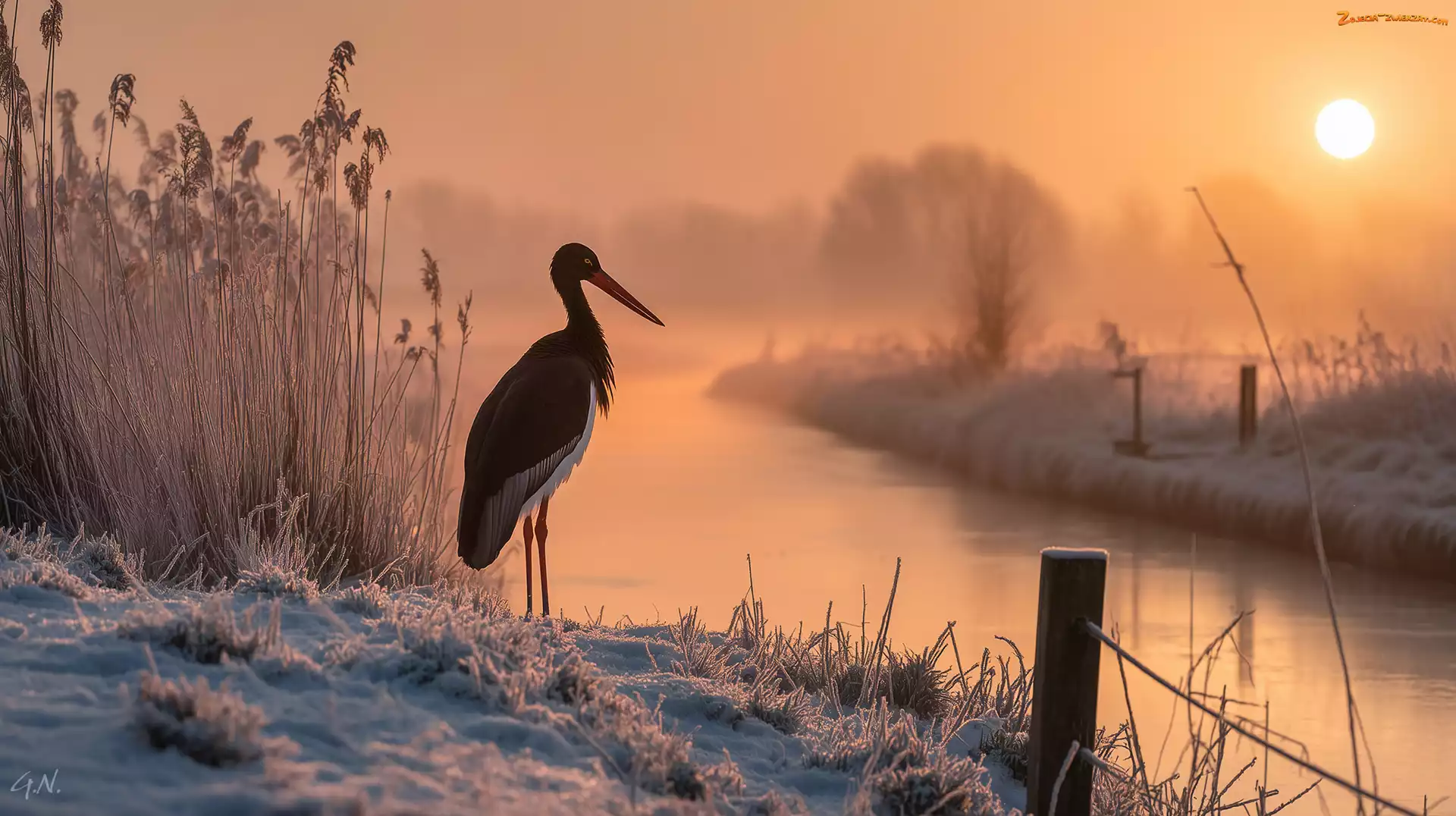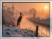 Zdjęcie: Zima, Bocian czarny, Rzeka, Trawy, Grafika Ai, Oszronione, Zachód słońca