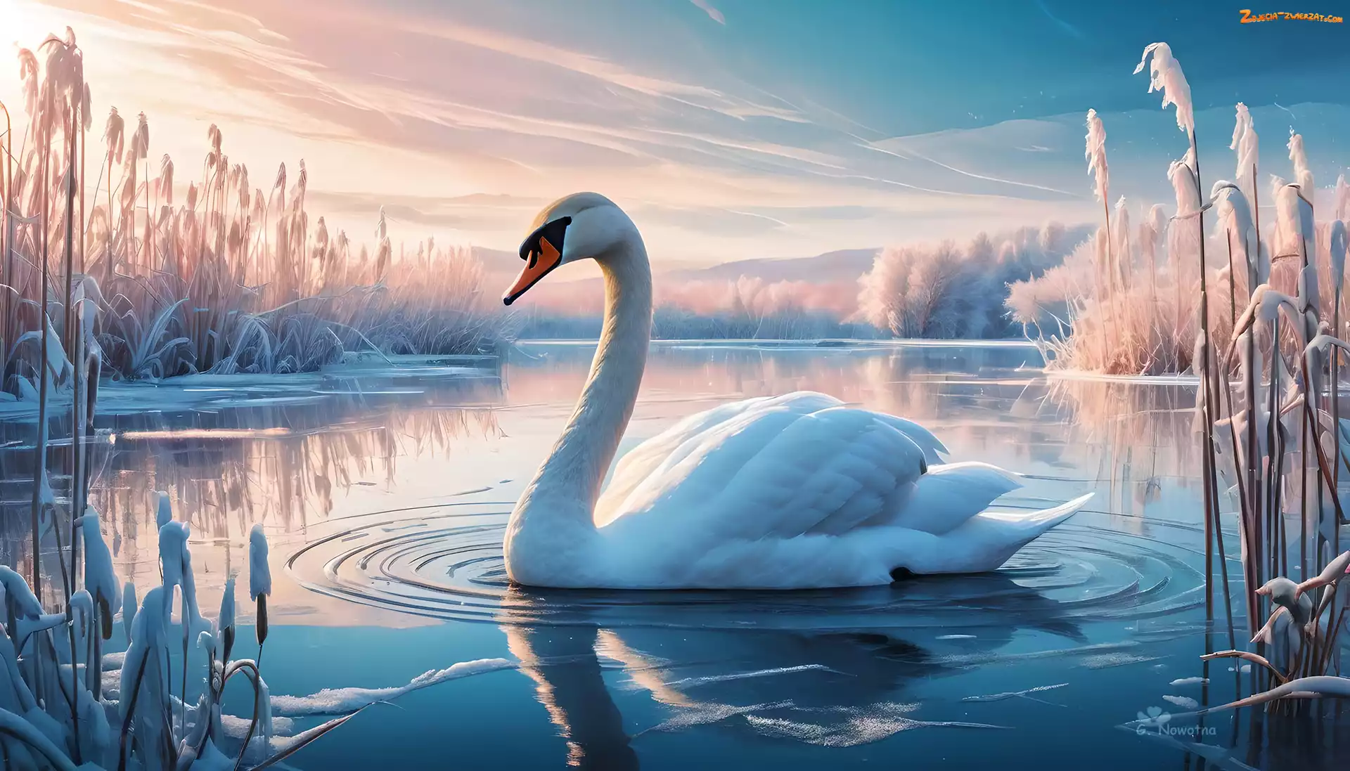 Zdjęcie: Szuwary, Zmarznięte, Grafika, Łabędź, Jezioro